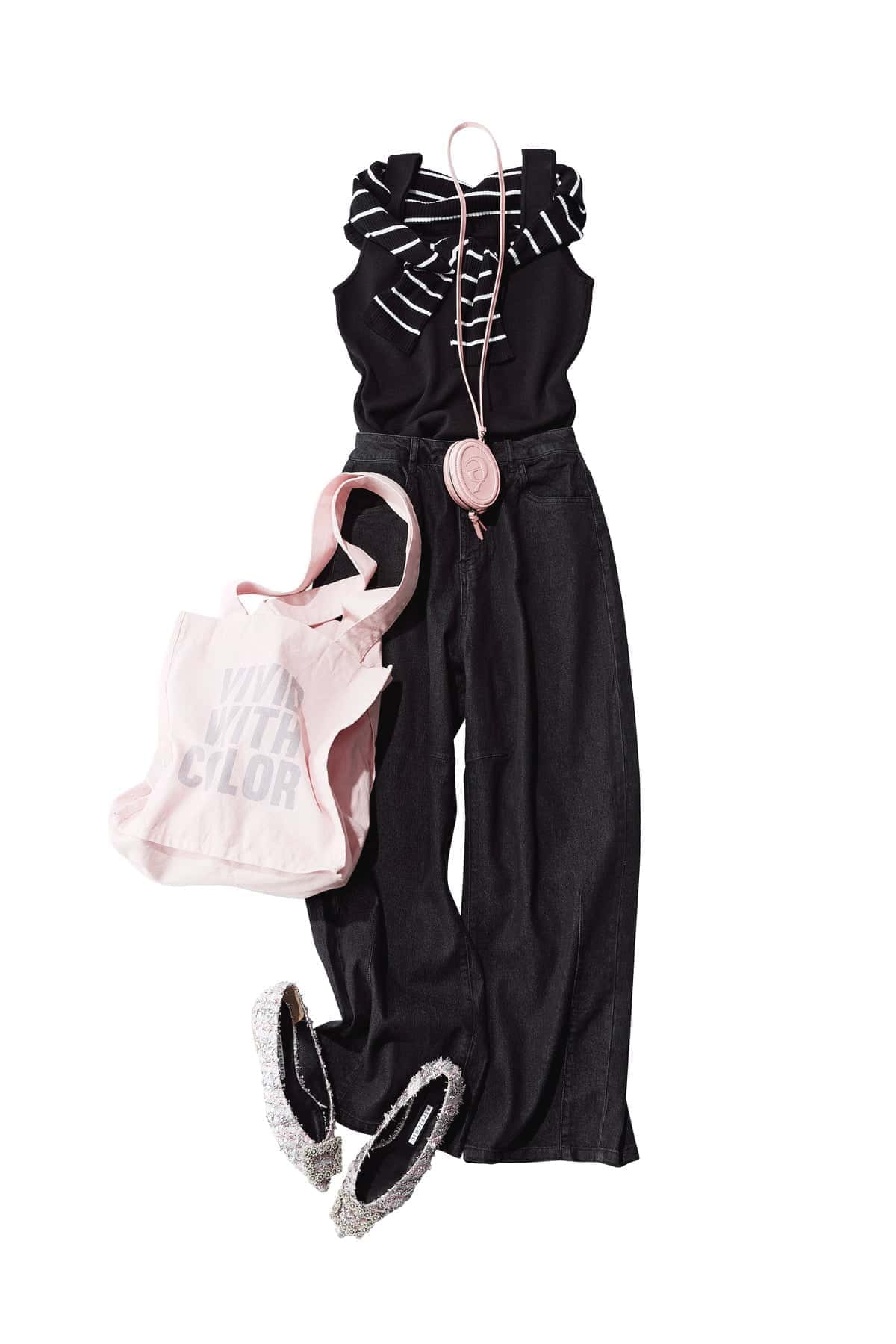 デニム¥4,290(神戸レタス)ニットタンクトップ¥12,100(アンクレイヴ)肩掛けにしたカーディガン[UVカット・マシンウォッシャブル]¥1,990(GU)マイクロミニバッグ¥11,550(アーカイブエプク)トートバッグ¥8,800(マイカ アンド ディール/マイカ アンド ディール 恵比寿店)パンプス¥42,900(ピッピシック/ベイジュ)