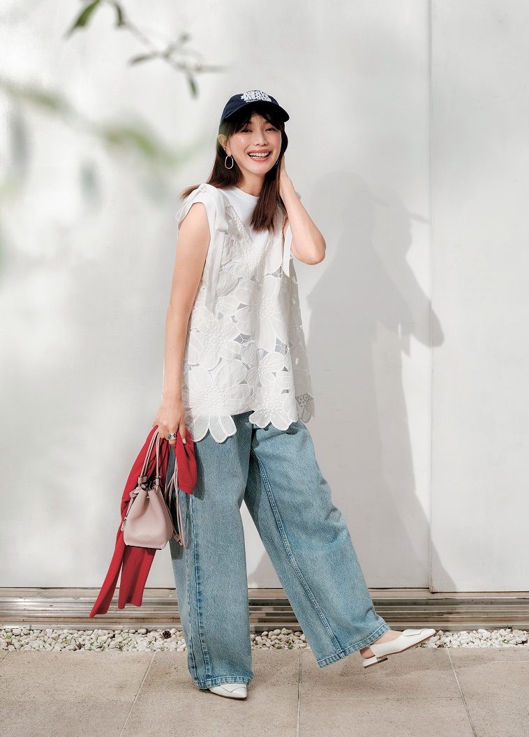 大ぶりの花柄レーストップスを重ねれば、デニムスタイルが一気に華やかに。ワイドシルエットが重さを感じさせず、抜け感ある大人カジュアルに仕上がります。キャップでカジュアルダウンしつつ、赤小物でアクセントを添えれば遊び心も忘れないスタイルに。