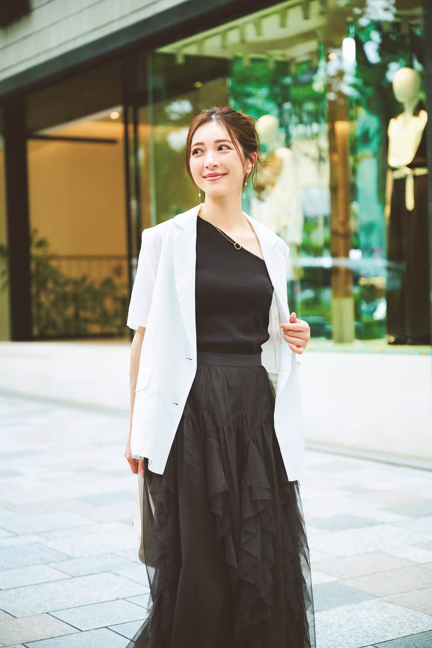 幾重もチュールが重なったリッチなチュールスカートを、アシメトリーなワンショルトップでモードに引き締め。甘さよりもシャープさを前に出すことで、鮮度の高い着こなしに仕上がります。白ジャケットを羽織って、都会的な抜け感もプラス。
