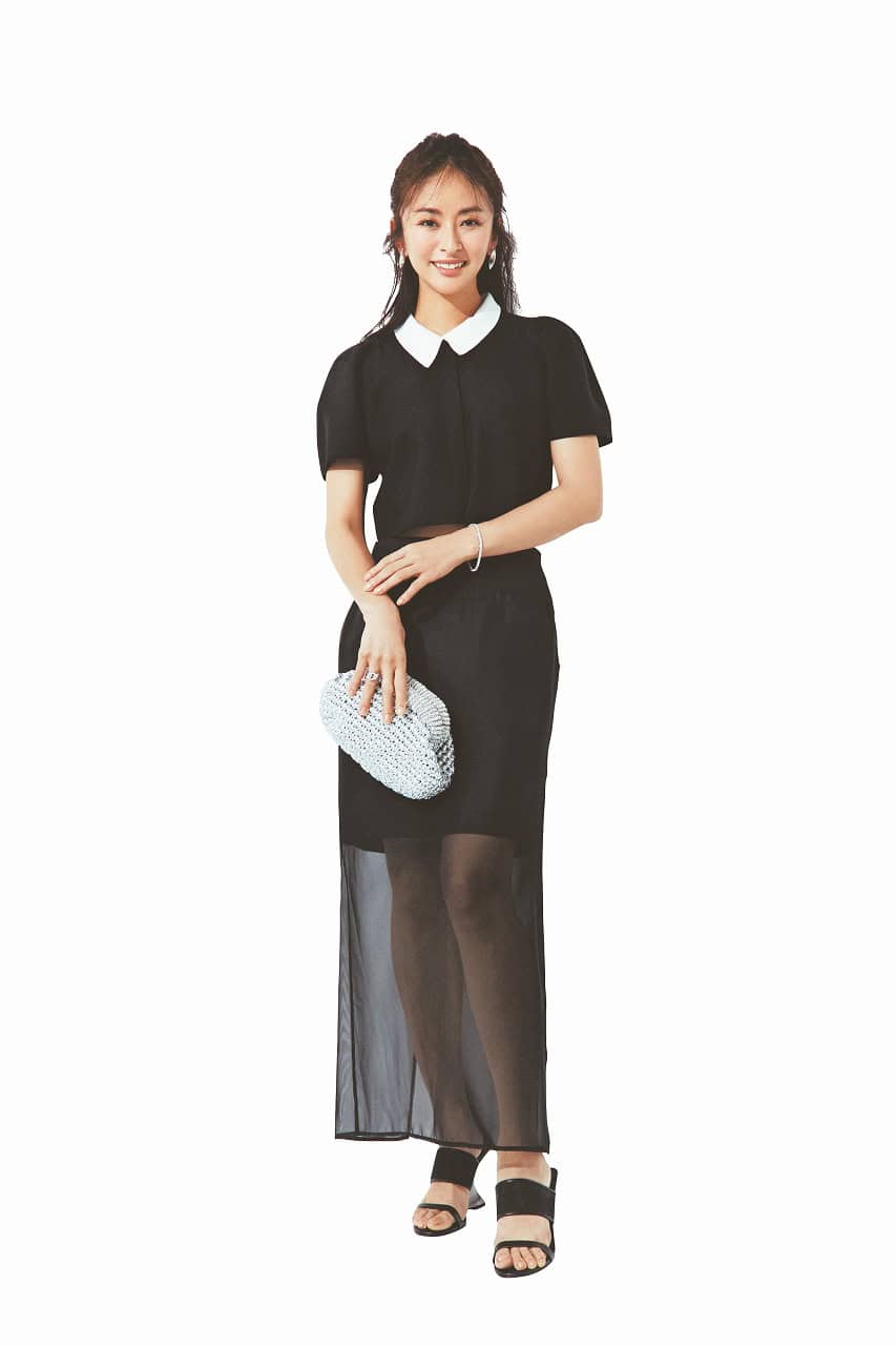 シアー素材をふわりとまとうスカートと白襟トップスで、清楚さと大胆さを両立。透け感のある素材がトレンド感を引き寄せつつ、きちんとした場にもふさわしいバランスに。フォーマルなシーンでも、自分らしさを忘れないモードな佇まいが完成します。