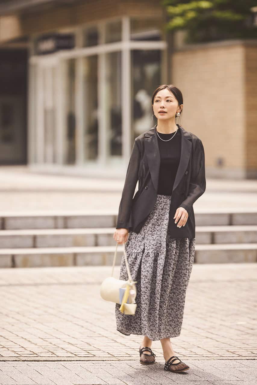 黒のシックな花柄ロングスカートなら、学校行事などオケージョンシーンにもなじみます。ジャケットで締めつつ、カラーバッグを効かせて軽やかさと遊び心をプラスすれば、堅苦しさのない好印象コーデに。
