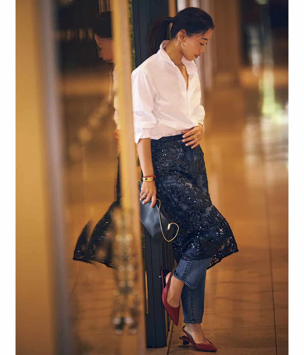 スパンコールスカート¥39,600(バウム・ウンド・ヘルガーデン/S&T)シャツ¥38,500(ロエフ/エイチ ビューティー&ユース)デニムパンツ¥25,300(レッドカード トーキョー/ゲストリスト)バッグ¥75,900(マエストソ/アマン)パンプス¥178,200(ピエール アルディ/ピエール アルディ 東京) ピアス¥7,040〈エムシー・スタジオ〉リング¥37,180 ゴールドバングル¥39,160〈ともにソコ〉赤ビーズブレスレット¥5,500〈ペラペラック〉(すべてZUTTOHOLIC)