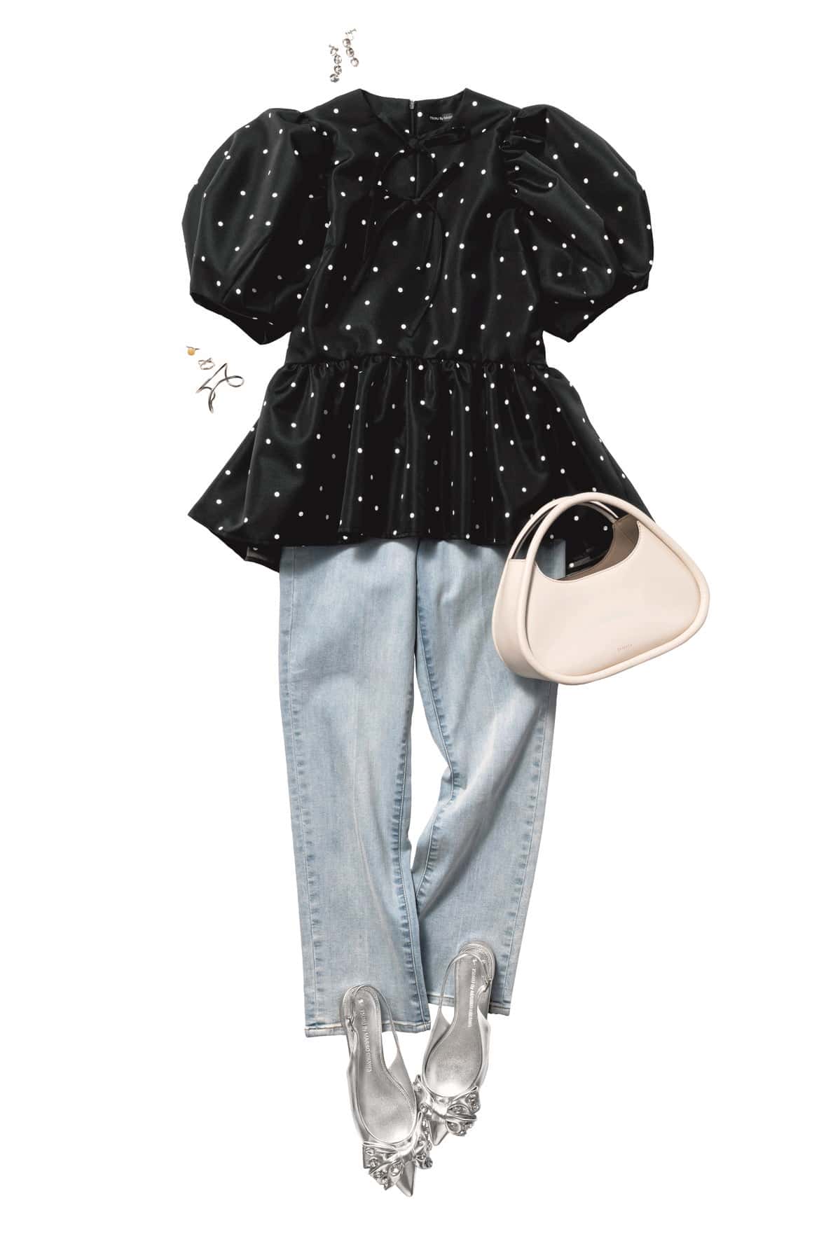 ぽわん袖のボリューム感で上半身をコンパクトに見せ、視線を上に集めてスタイルアップ。気持ちが上がる甘めなデザインと、ペプラムによるスタイルアップ効果で、デイリーに着ているラフなデニムも特別感のあるコーデに応用できます。仕上げにシルバーのパンプスでほんのりモードに振ればスタイルも気分もぐっとシャープに。