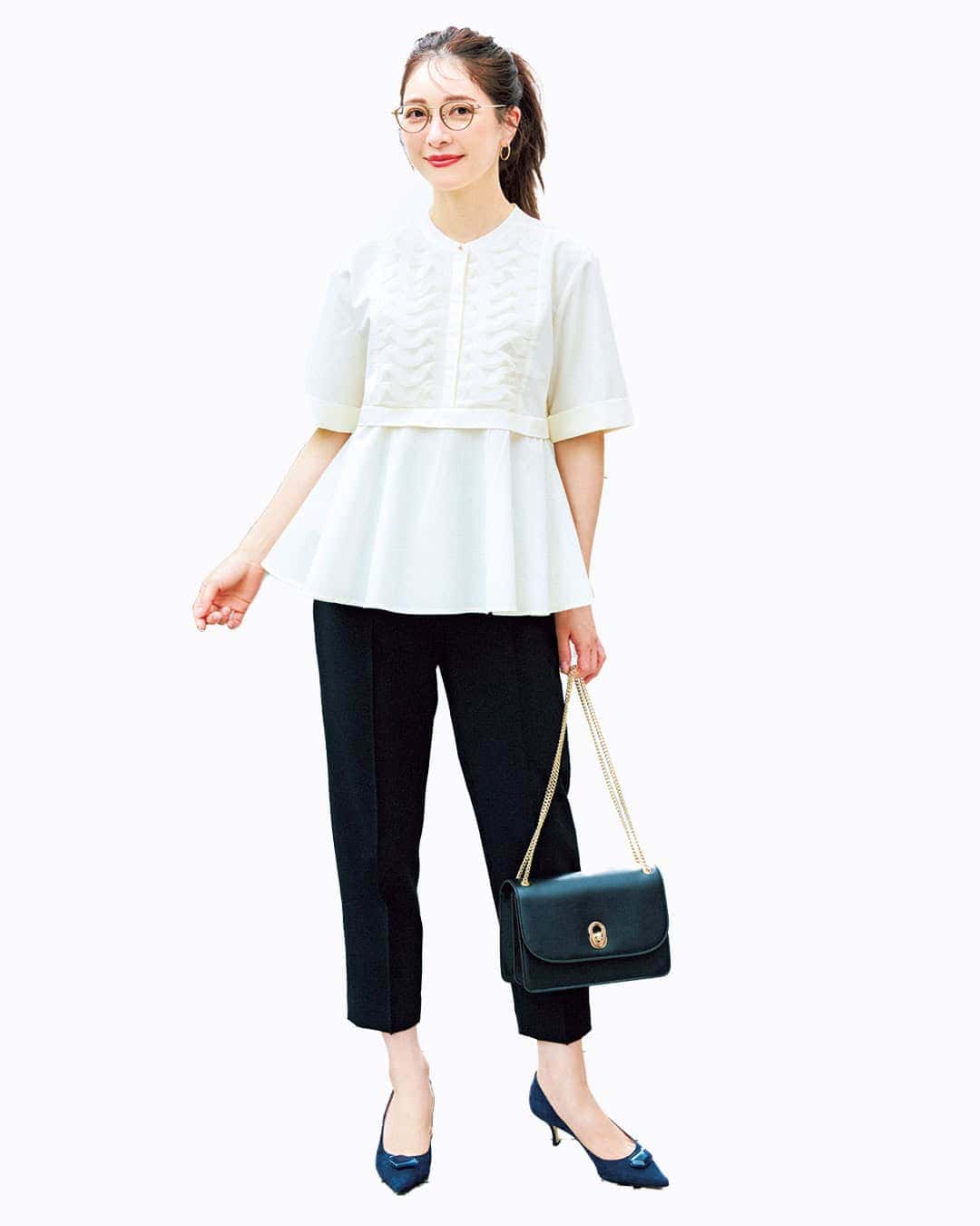 ブラウス¥16,940(トラッツォドンナ)パンツ¥22,990(アンクレイヴ/アンクレイヴ〈オンワード樫山〉)バッグ¥13,750(アルテミス by ダイアナ/アルテミス by ダイアナ アーバンドックららぽーと豊洲店)メガネ¥39,600(ブラン/ライト)ピアス¥99,000(ココシュニック)シューズ/スタイリスト私物