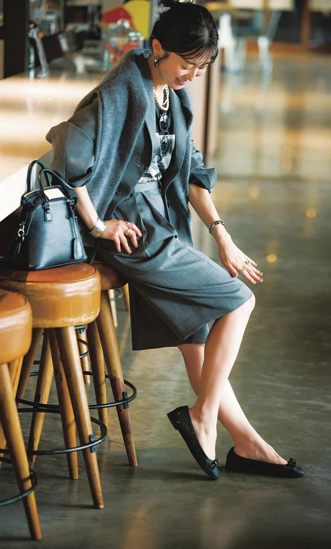 セットアップをフォト Tで着崩して肩の力が 抜けたカジュアルに。 ミニスカより無理なく 挑戦でき、旬顔にもな れてオシャレ談義に花 が咲きそう。レイヤード で温度調節にも最適。