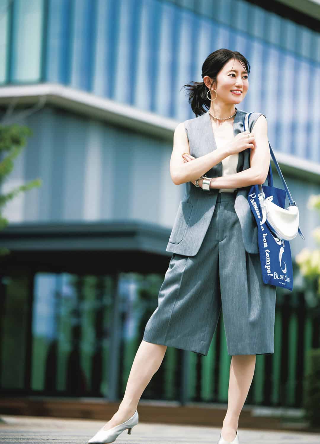 初めましてのお仕事シ ーンにジレ×ハーフパ ンツのセットアップで。 きちんと感とこなれ感 の両立で新鮮な印象に。 インナーはMY定番の タンクトップで猛暑で も涼しげに見せて。