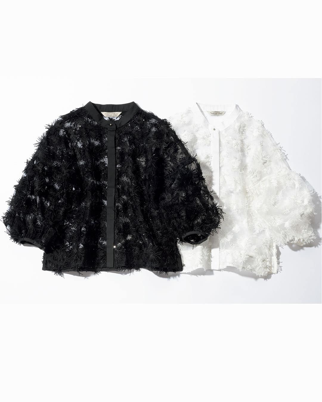 旬のブラウンにブラック、柔らかなホワイトと、気分とオシャレスイッチに頼れるカラーを選び、涼しげな透け素材のブラウスを作りました。ポイントは、何と言ってもその着回し力。前後で着られるうえに、ボタンを開ければ羽織ものとしても重宝。ONするだけで着映えて様々なシーンで役立つのが魅力。秋の初めに一枚あると心強い、秀逸ブラウスです。