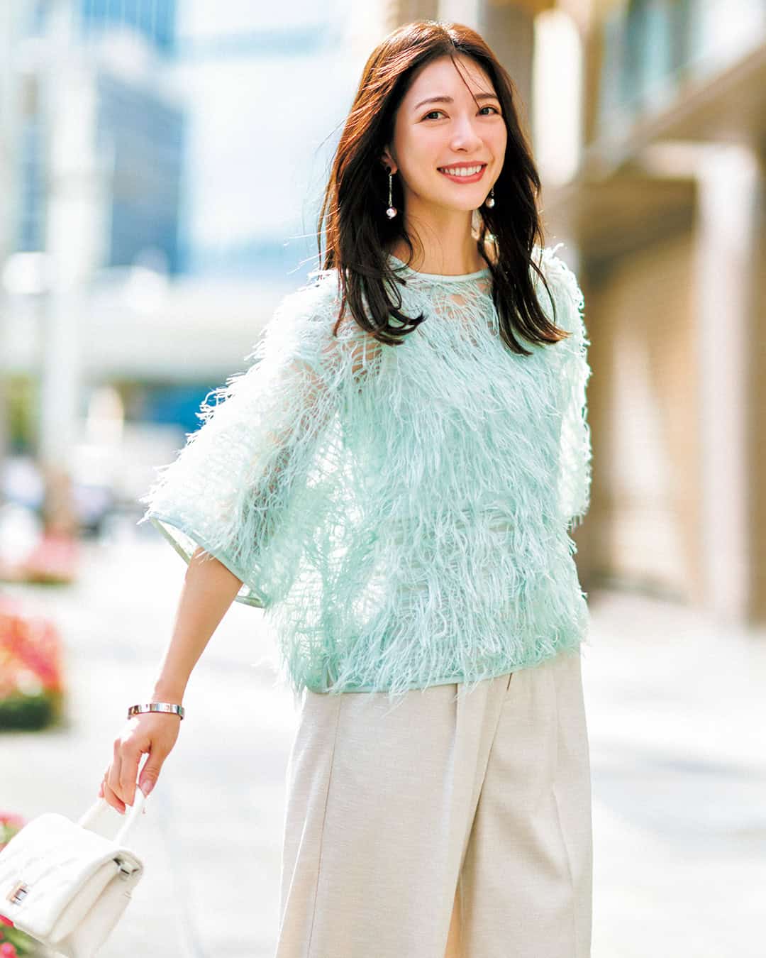 【写真1枚目】ブラウス¥19,800(フェリーチェ)パンツ¥24,200(ジャスグリッティー)バッグ¥16,500(ダイアナ/ダイアナ 銀座本店)ピアス¥13,200バングル¥24,200(ともにワンエーアールバイウノアエレ/ともにウノアエレ ジャパン)