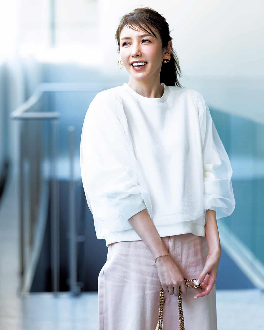 【1枚目】ブラウス¥13,970パンツ¥14,960(ともにDay by Day It’s international)時計¥20,900(マトウ/エイチエムエスウォッチストア 表参道)イヤリング¥6,820(イットアトリエ/フォーティーンショールーム)【2枚目】ブラウス¥13.970パンツ¥14,960(ともにDay by Day It’s international)バッグ ¥12,100(Cepica/ジオン商事)ネックレス¥46,200〈ミチウィルウェイ〉ピアス ¥39,600〈モニス〉(ともにフォーティーンショールーム)キャミソール(スタイリスト私物)