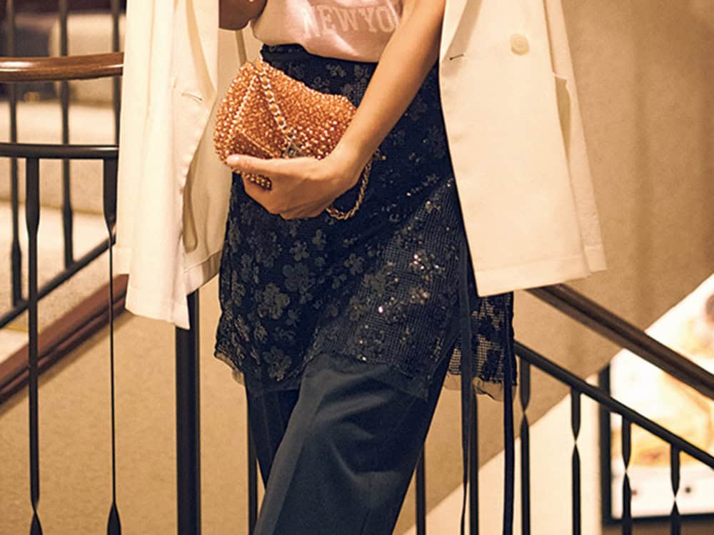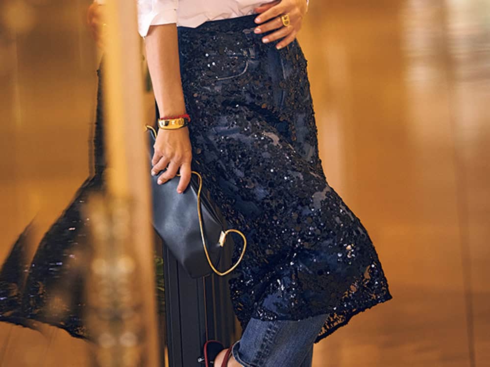 スパンコールスカート¥39,600(バウム・ウンド・ヘルガーデン/S&T) シャツ¥38,500(ロエフ/エイチ ビューティー&ユース) デニムパンツ¥25,300(レッドカード トーキョー/ゲストリスト) バッグ¥75,900(マエストソ/アマン) リング¥37,180 ゴールドバングル¥39,160〈ともにソコ〉 赤ビーズブレスレット¥5,500〈ペラペラック〉(すべてZUTTOHOLIC)