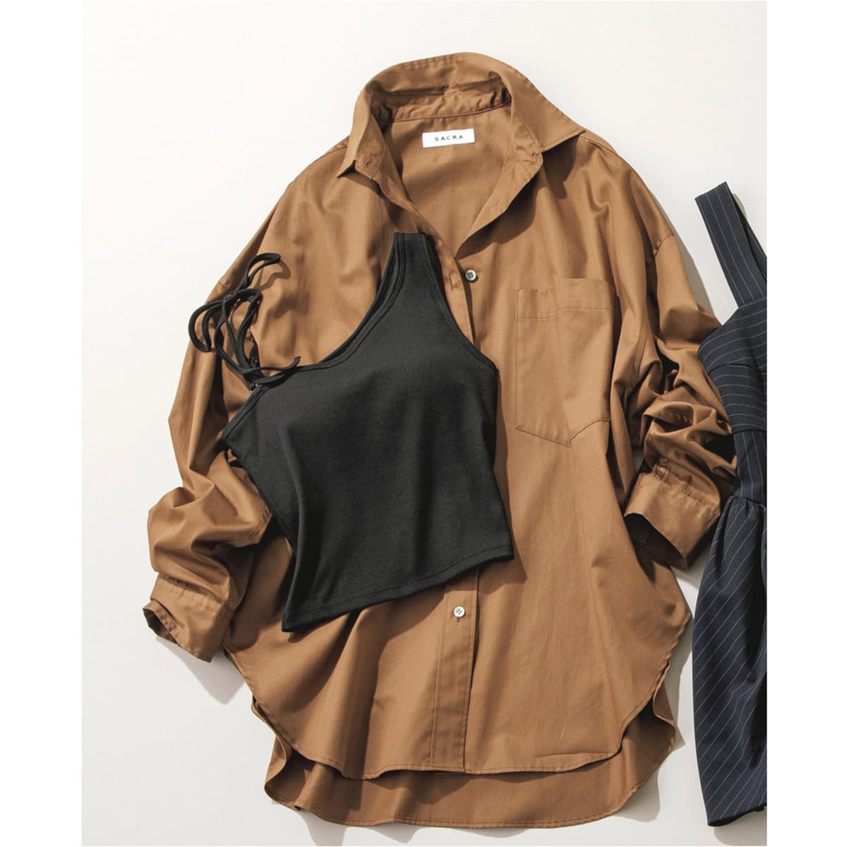 ブラウンシャツ¥39,600(サクラ/インターリブ)ワンショルダータンクトップ[抗菌防臭・一部店舗のみ販売]¥1,290(GU)