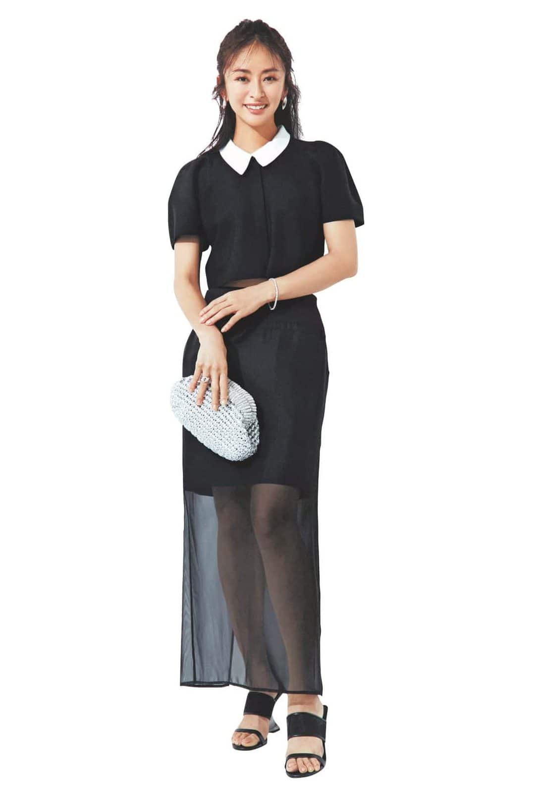 清潔感と大人の余裕を兼ね備えたシアー素材のトップスは、きちんとした場にも対応可能。ロングスカートと組み合わせることで、しっかり者のロジスティシャンのような落ち着きと華やかさのある印象に。