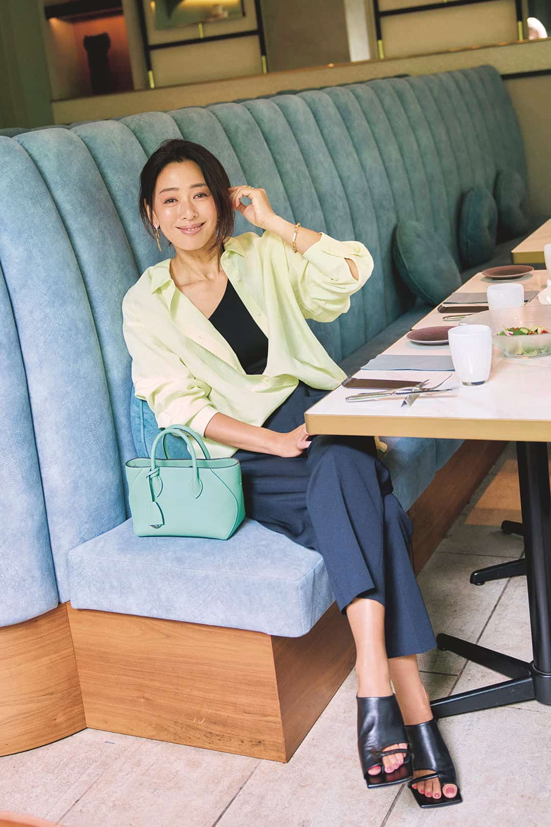 シャツ¥9,990(PLST)ワンショルダータンク¥13,200(LE PHIL/LE PHIL NEWoMan 新宿店)ネイビーパンツ¥29,700(フィーニー) バッグ¥169,400(BONAVENTURA/ボナベン チュラ カスタマーサポート)ミュール¥18,700(ル タロン グリーズ/ル タロン グリーズ ルミネ新宿 店)ピアス¥39,600 チェーンブレスレット¥70,400 スクエアリング¥26,400 リング¥50,600(すべてブランイリス/ブランイリス トーキョー)