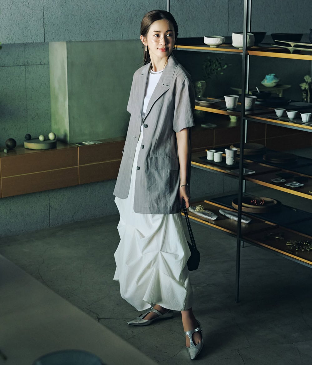 2位 主役スカートの甘さをキレよく引き立てる【半袖シアージャケット】