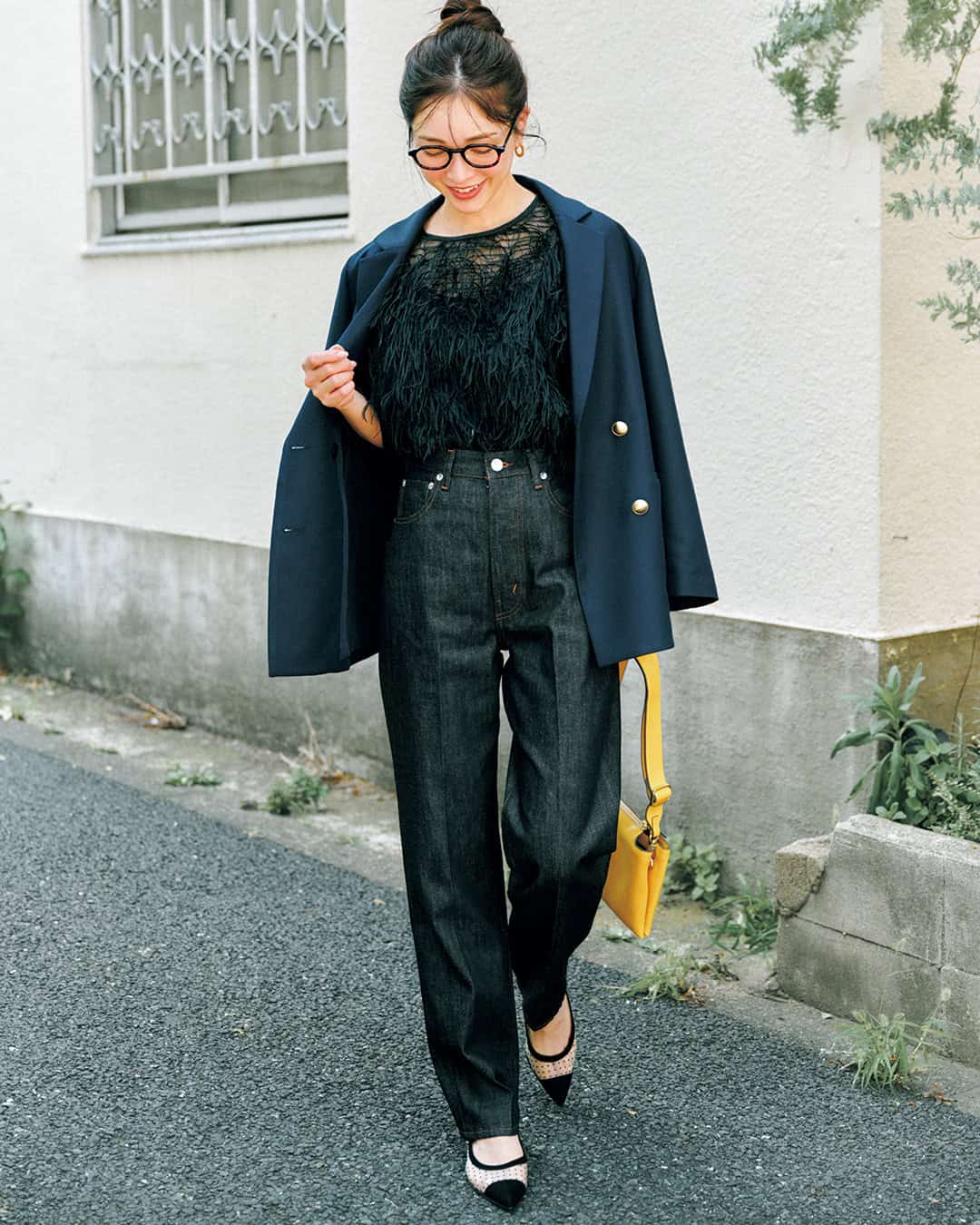 ブラウス¥19,800(フェリーチェ)ジャケット¥23,100(マイストラーダ)パンツ¥22,000(ウォードブルー/ヤマツゥ)バッグ¥39,600(オルセット/オルサ)シューズ¥34,100(ファビオ ルスコーニ/伊勢丹新宿本店 本館2階 婦人靴)メガネ¥38,500(ブラン/ライト)ピアス¥146,300(ウノアエレ/ウノアエレ ジャパン)
