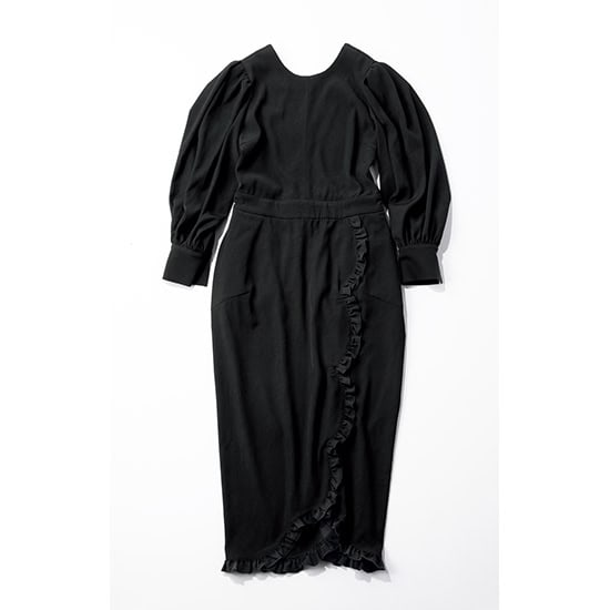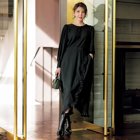 着るだけでオシャレが決まるドラマティックワンピ。腰回りはちょっとコクーンにして今どきのシルエットに仕上げ、さらにウエスト下にはパニエをしのばせ、ヒップラインがキレイに見えるようにしました。後ろウエストはゴムでV開きです。スカート部分には上から下へ大胆にフリルをあしらいました。