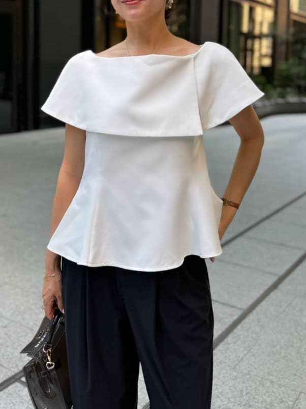 tops/ur’s ¥6,589 シンプルなのに着映えするデザインが可愛い!と一目惚れ買いしました。ボートネックなのでデコルテが綺麗に見え、二の腕カバーにもなるケープ風の大きな襟は小顔効果と華奢見えまで叶うお気に入りです。