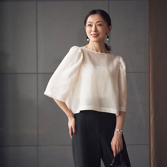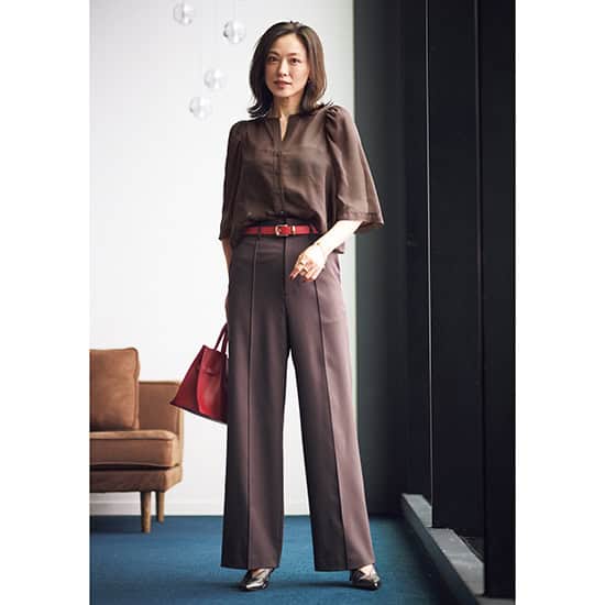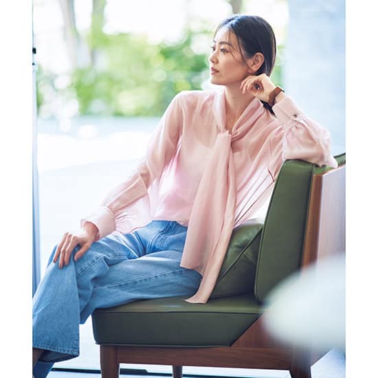 【1枚目】ブラウス¥13.970パンツ¥14,960(ともにDay by Day It’s international)バッグ ¥12,100(Cepica/ジオン商事)ネックレス¥46,200〈ミチウィルウェイ〉ピアス ¥39,600〈モニス〉(ともにフォーティーンショールーム)キャミソール(スタイリスト私物)【2枚目】ブラウス¥13,970パンツ¥14,960(ともにDay by Day It’s international) キャミソール¥5,990(アンフィーロ)バッグ ¥31.900(ヴィオラドーロ)パンプス¥33,000(銀座かねまつ/銀座かねまつ6丁目本店)ピアス¥162,800太リング¥253,000リング¥231,000〈モニス〉ブレスレット¥6,330〈エイチアッシュ〉(すべてフォーティーンショールーム)ベルト(スタイリスト私物)【3枚目】ブラウス¥13,970パンツ¥14,960(ともにDay by Day It’s international)時計¥20,900(マトウ/エイチエムエスウォッチストア 表参道)イヤリング¥6,820(イットアトリエ/フォーティーンショールーム)
