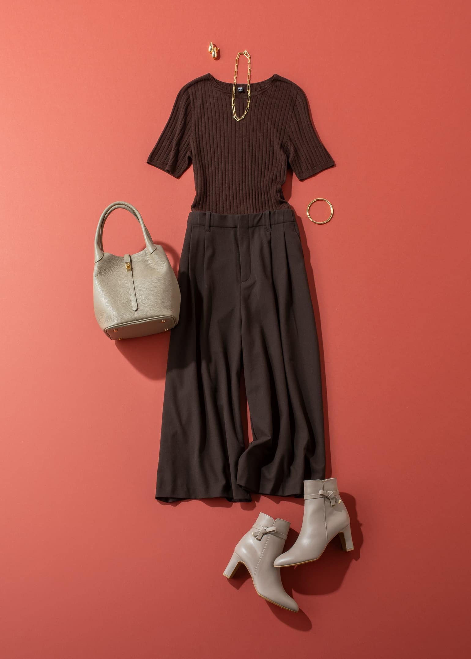 シックなワントーンは、シルエットや素材感で奥行きを出すと、ぐっと垢抜けます。ジャストフィットのリブニットには、ひらりと軽やかなワイドパンツがベストなバランス。小物は、ベージュ系でトーンを揃えつつ抜け感を。仕上げにゴールドのアクセサリーを効かせれば、華やかな秋冬ワントーンコーデの完成です。