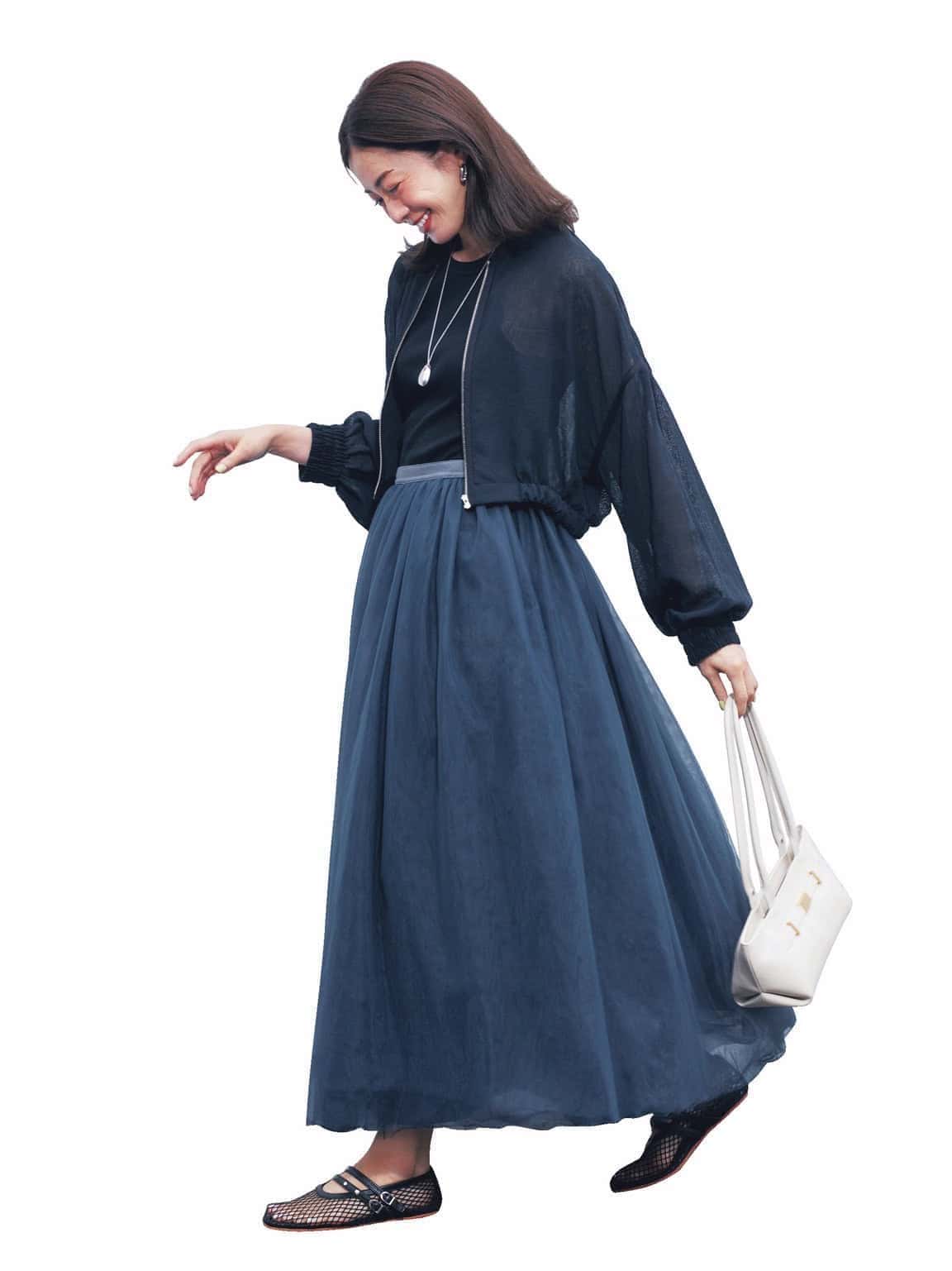 肌寒さを感じ始める26℃の日は、いよいよ長袖の羽織りをプラス。トレンドのシアー素材は通気性の良さも魅力で、やっぱり暑くて脱ぐ、脱ぐと寒いのスパイラルとも無縁。黒でまとめたスタイルも重たく見えず、しっとりとした女性らしさを漂わせます。秋の入口にぴったりなレイヤードスタイルです。