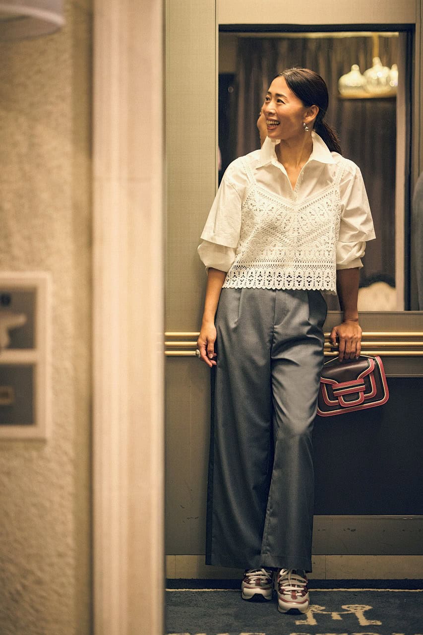 キャミソール¥13,200 パンツ¥22,550(ともにアルページュストーリー プレスルーム) シャツ¥17,930(メゾンスペシャル/メゾンスペシャル 青山店) バッグ¥209,000 スニーカー¥124,{hlb}300(ともにピエール アルディ/ピエール アルディ 東京) ピアス¥11,990〈ラブ・エージェイ〉 リング¥51,700〈バルブス〉(ともにZUTTOHOLIC)