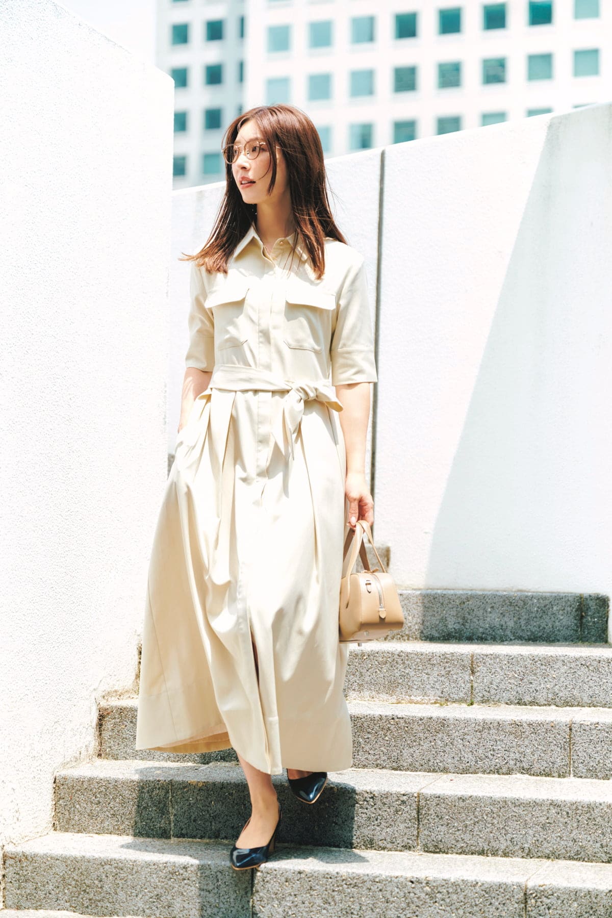 一枚できちんと感を演出できるシャツワンピ。ベージュの柔らかな色味なら堅くなりすぎず、親しみやすい印象に。小物は同系色でまとめつつ、黒のフラットシューズで引き締めれば、上品さが漂う“きちんと見えカジュアル”が完成。ウエストリボンで自然なくびれを作れば、スタイルアップも叶います。