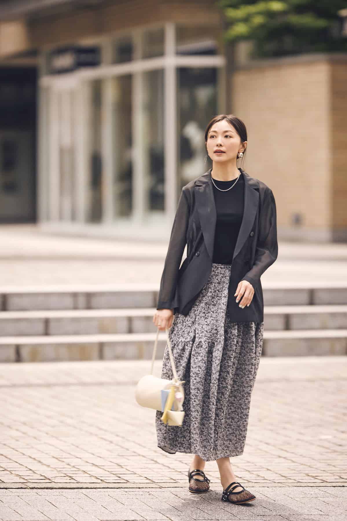 やっぱり頼れる、“これ羽織っておけばなんとかなる”黒ジャケット。シアー素材なら、きちんと感を保ちつつ、洒落感も出せる優秀アイテム。トップスも黒でまとめつつ、花柄のロングスカートでほんのり甘さをプラスして。パールのネックレスや小ぶりバッグを添えて、上品かつ華やかに。カジュアルなイベントなら、メッシュシューズで今っぽさ後押しもあり!