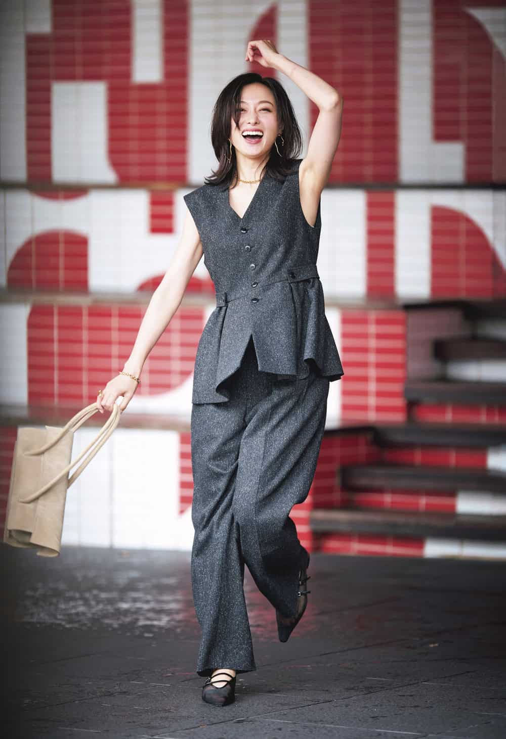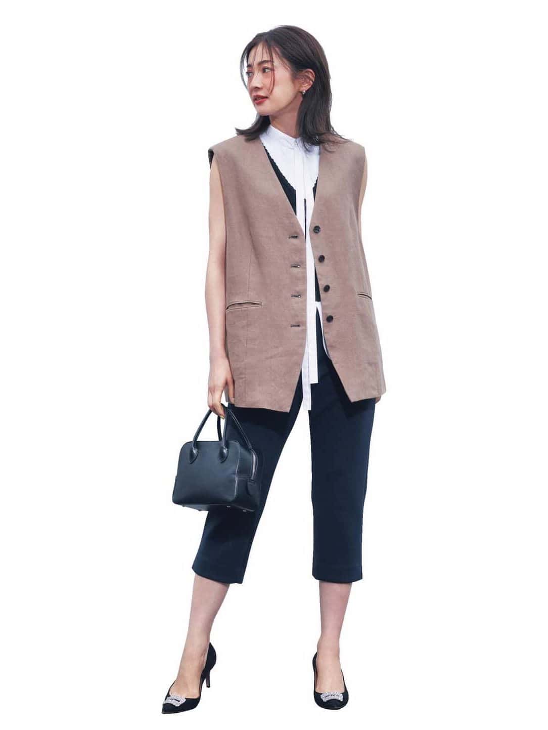 ジレ¥57,200(サクラ/インターリブ)ニットベスト¥38,500(コルデラ/シンゾーン ルミネ有楽町店)ブラウス¥33,000(デパリエ/デパリエ 伊勢丹新宿店)パンツ¥38,500(シー/エスストア)バッグ¥68,200(メゾン カナウ/ヤマニ)パンプス¥97,900(ペリーコ/アマン)ピアス¥29,700(リューク)