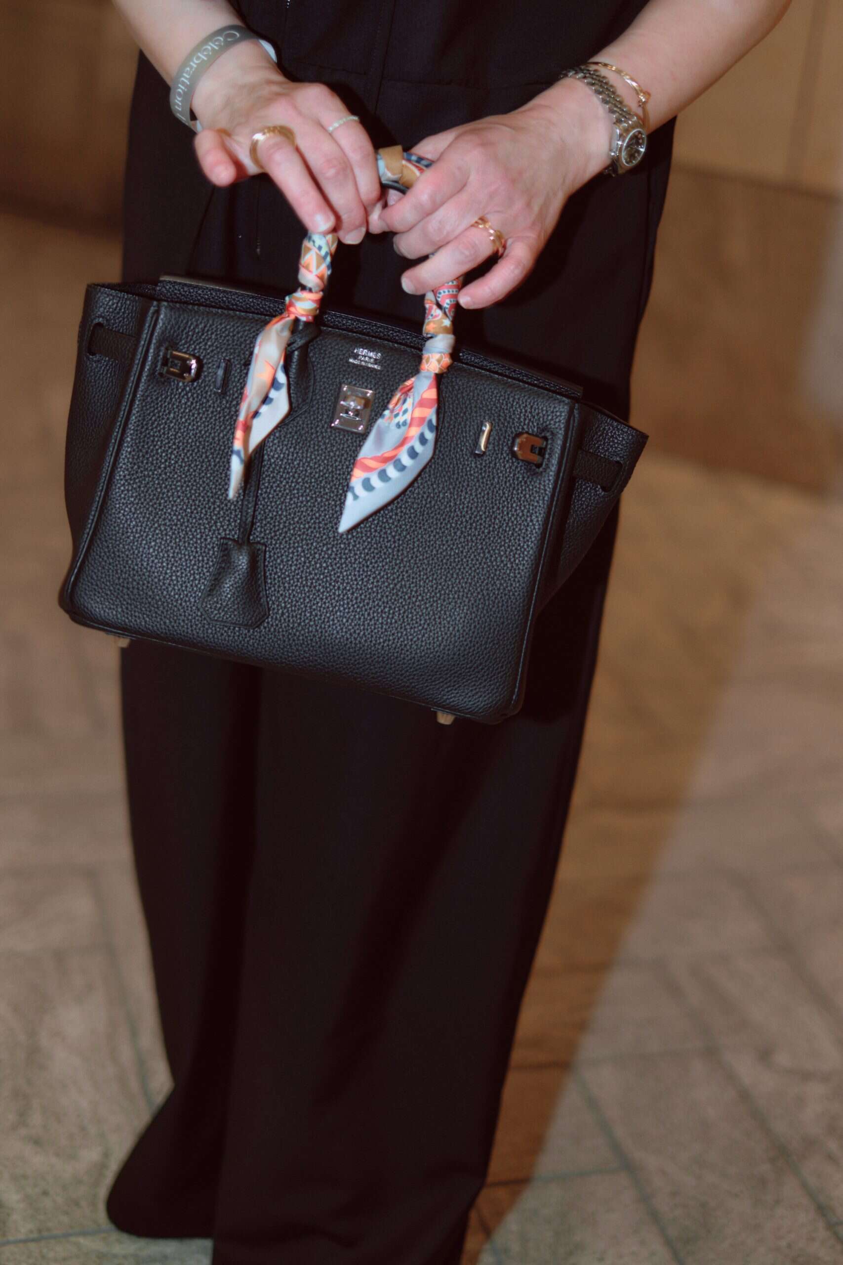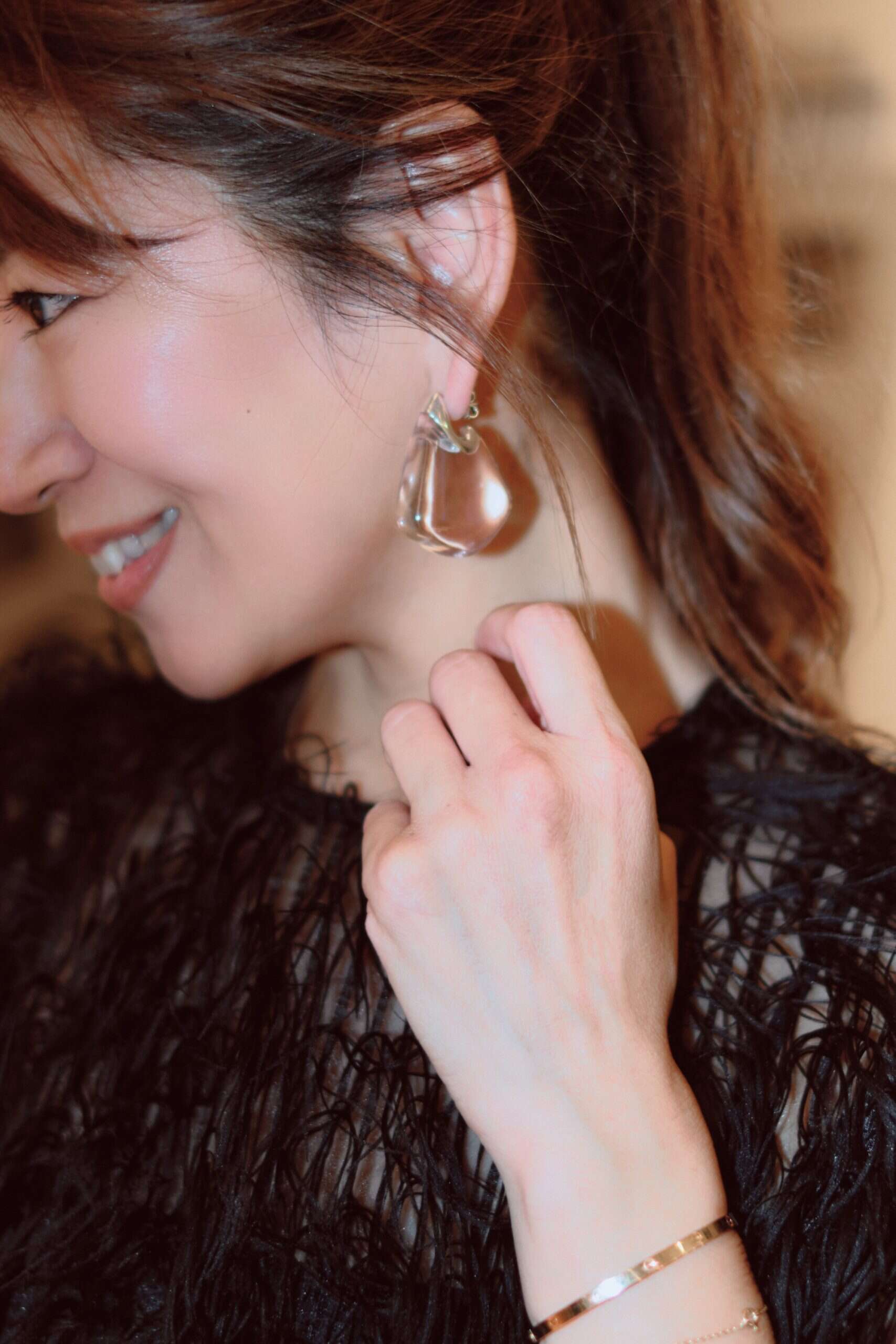 洋服はモノトーンの組み合わせが多い方。主人とのお出かけやオシャレしたい時は、ワンポイントにキラキラ感や光沢感をプラス。異素材のアイテムを1~2点入れることで、オールブラックに少し大人カワイイ雰囲気を足せたり、さらにモードにまとめられたり。インパクトのある小物たちが一役かってくれます。