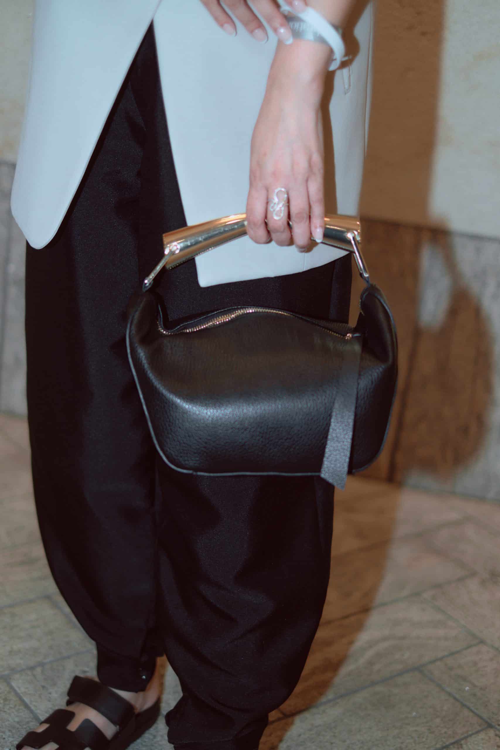 夜のパーティーだったので、夏だけど、敢えてのオールブラックにまとめました。重く見えないように足元には抜け感を、華奢なサンダルで演出しています。