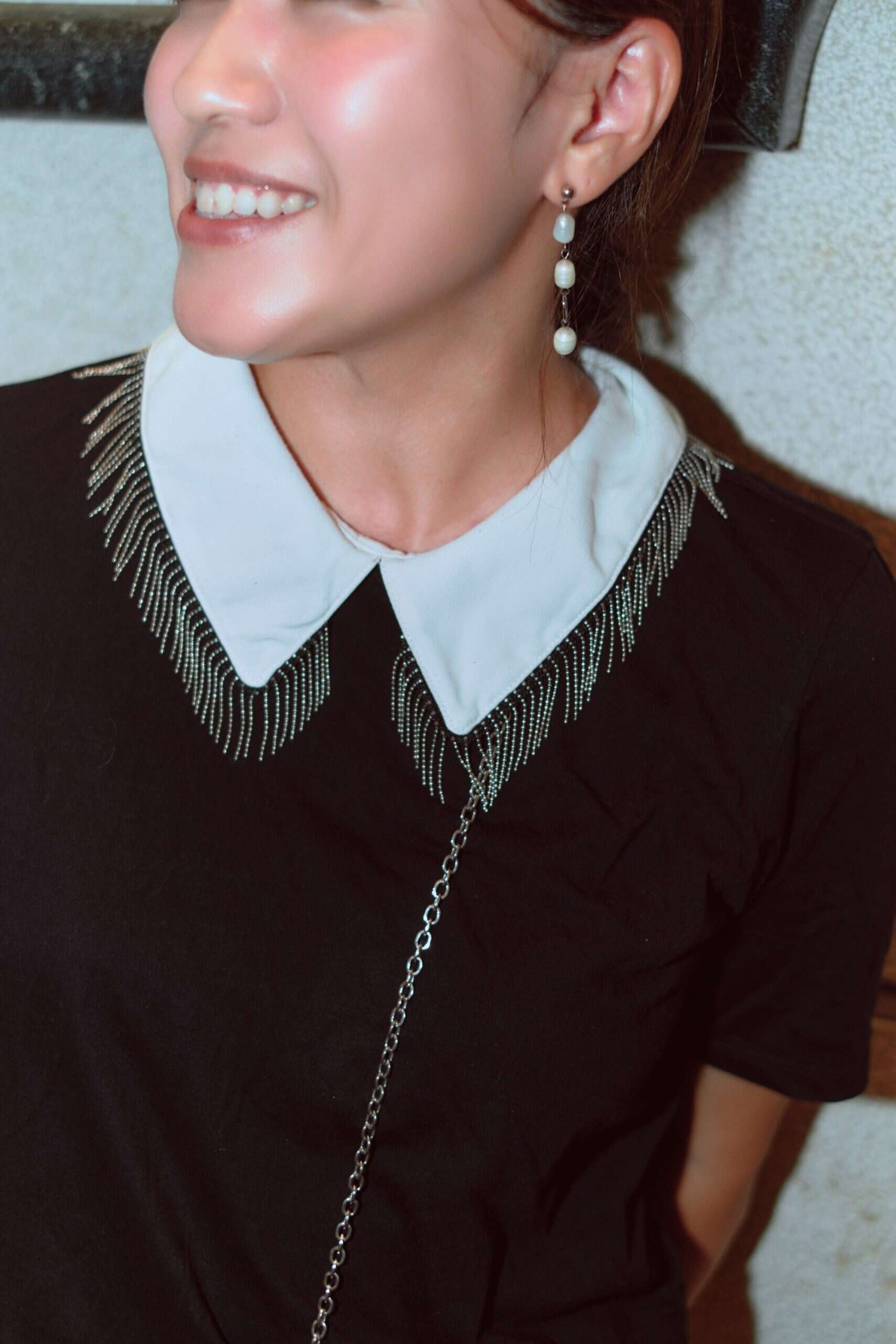 オールブラックでは暑苦しく、重くなるかなと思いZARAで見つけたホワイトカラーを選びました。ビジュー襟がアクセサリー替わりに顔周りをパッと明るくみせてくれます。エレガントになりすぎないように足元はカジュアルに。バランスをとって髪もコンパクトにまとめました。