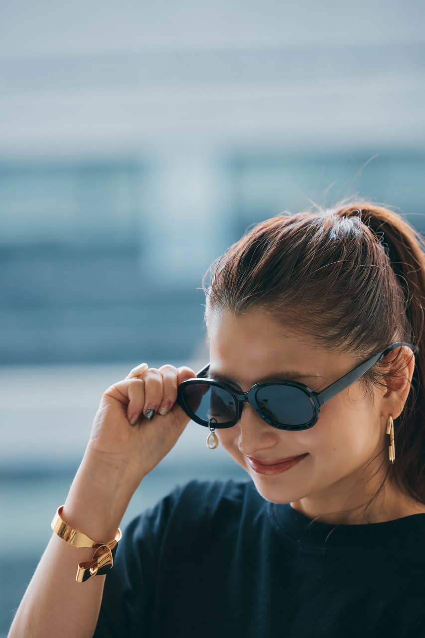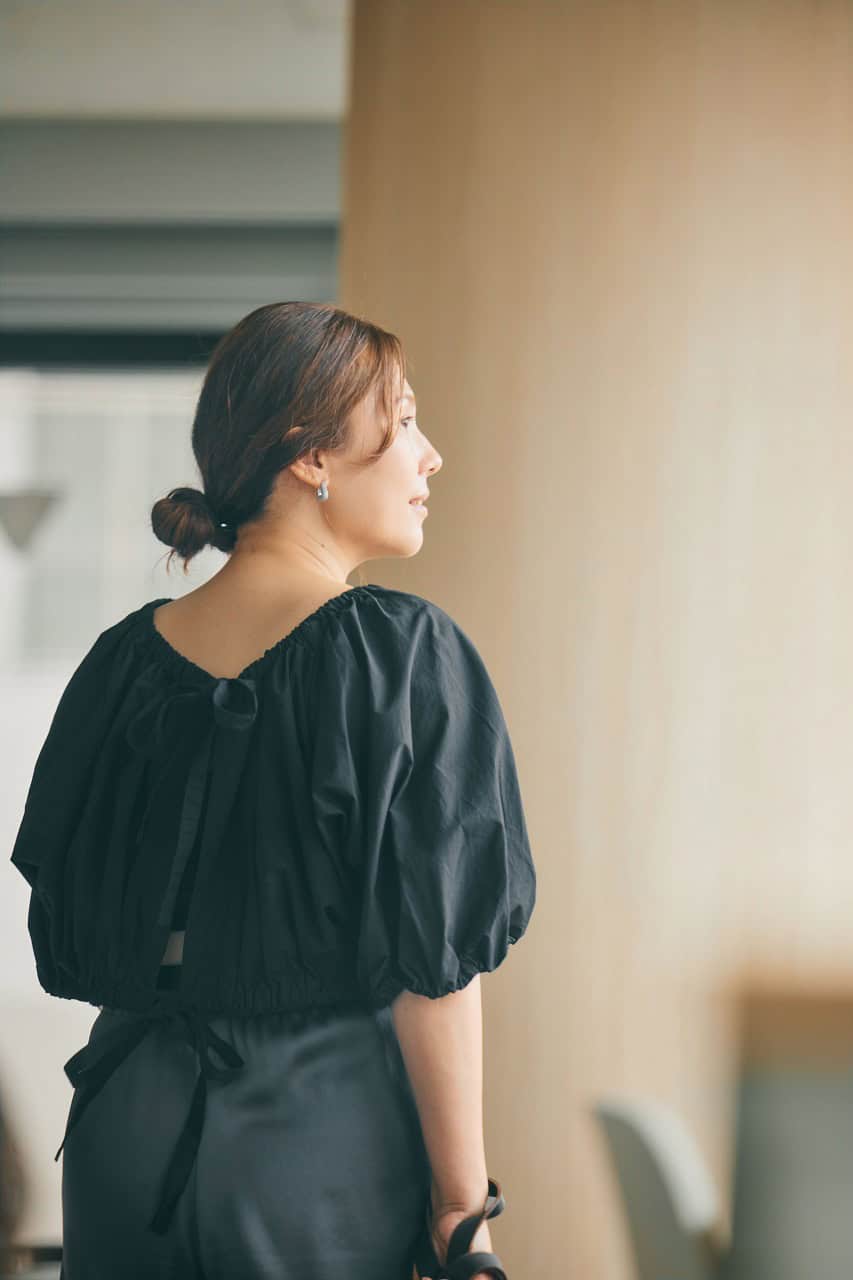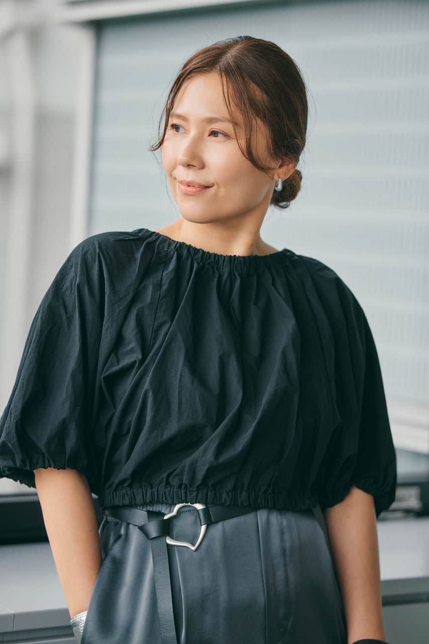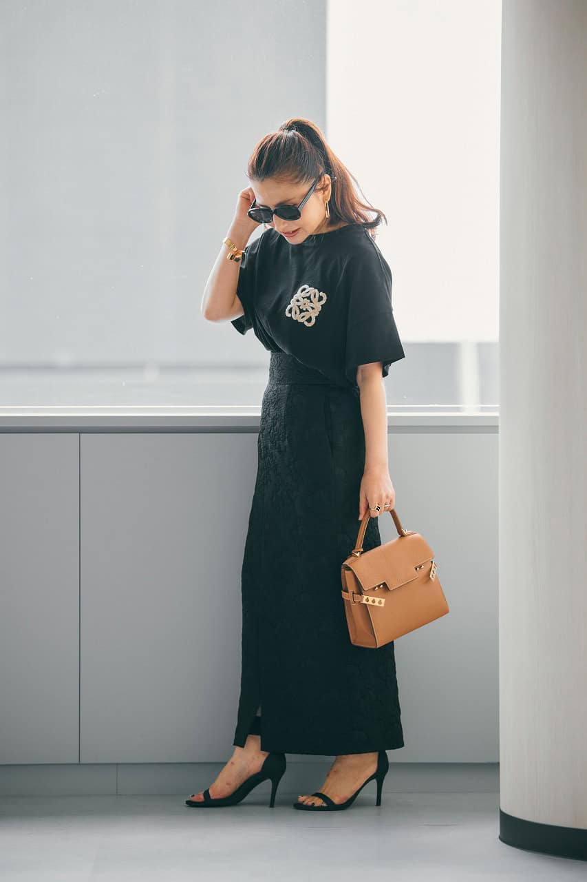 「STORY認定パーソナルスタイリスト2期生の同期たちと、美味しいシャンパンが飲める話題のお店で夜女子会! のイメージです。オシャレさんたちが集まる場で意識したいのは、肩肘張らないトレンド感と自分らしさ。存在感のあるTシャツをメインに、女性らしいタイトスカートやオールブラックで、大好きなハンサムエレガントなテイストに。スカートはジャガード織でオールブラックにメリハリを。身長的にハンサムすぎるのは似合わないため、ポニーテールで軽やかに見せてバランスを調整」