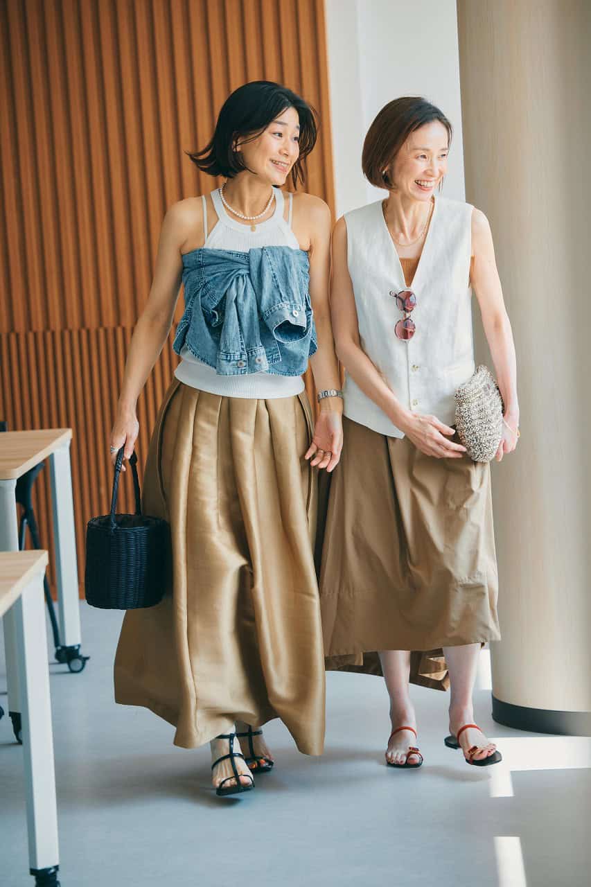 「STORY仲間とワイワイお洒落談義をする女子会には、キレイめコーデをベースにクールなエッセンスをひと匙。艶のあるベージュのボリュームスカートも、アメスリやデニムシャツで甘すぎずラフなムードに。バッグ&サンダルは黒でまとめてシャープなメリハリを」(左:大島弘子)