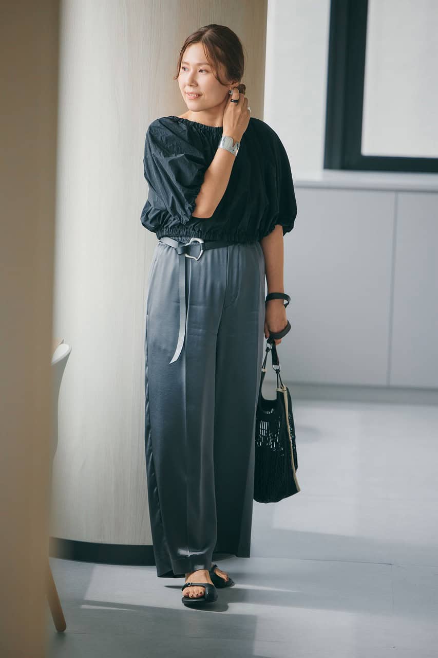 ★ コーデ④ サテンパンツとシルバーアクセの艶めきでモノトーンスタイルを底上げ