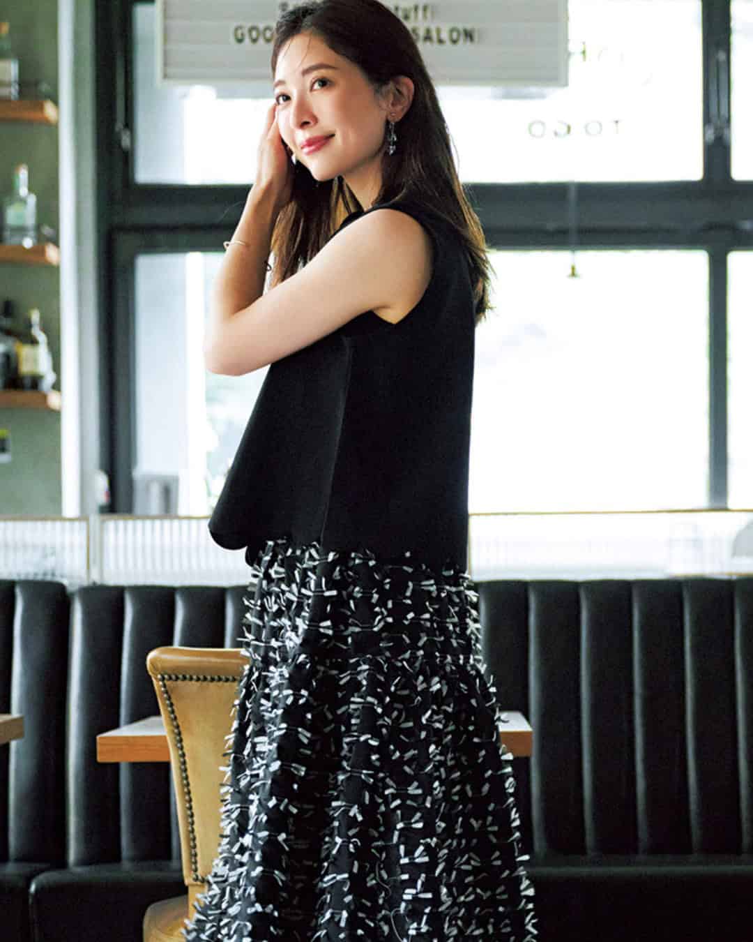【写真1枚目】ジレ¥24,200(アンクレイヴ/アンクレイヴ〈オンワード樫山〉)Tシャツ¥9,680(スローン/ザ ショップ スローン 神戸)スカート¥20,900(シー/エスストア)ピアス¥12,100バングル¥25,300(ともにワンエーアールバイウノアエレ/ともにウノアエレ ジャパン)バッグ/スタイリスト私物