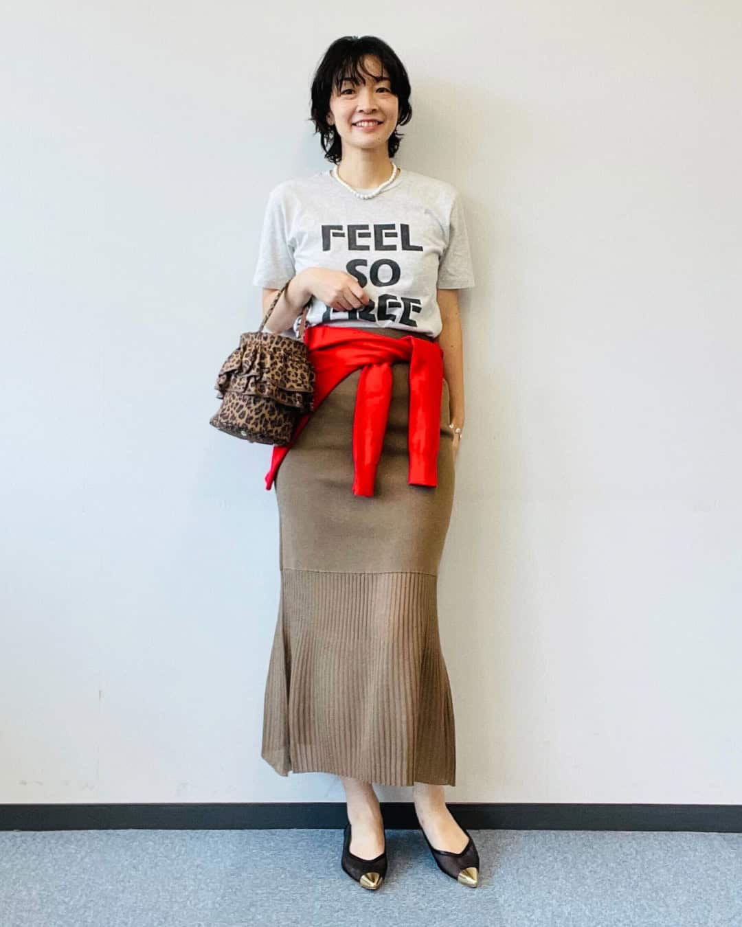ロゴTと合わせてカジュアルダウンしつつ、赤ニットを効かせて華やぎをプラス。小物はアニマル柄バッグで遊び心を加えました。カジュアル感がありながらも女性らしさを忘れない、友人とのお出かけにおすすめです。