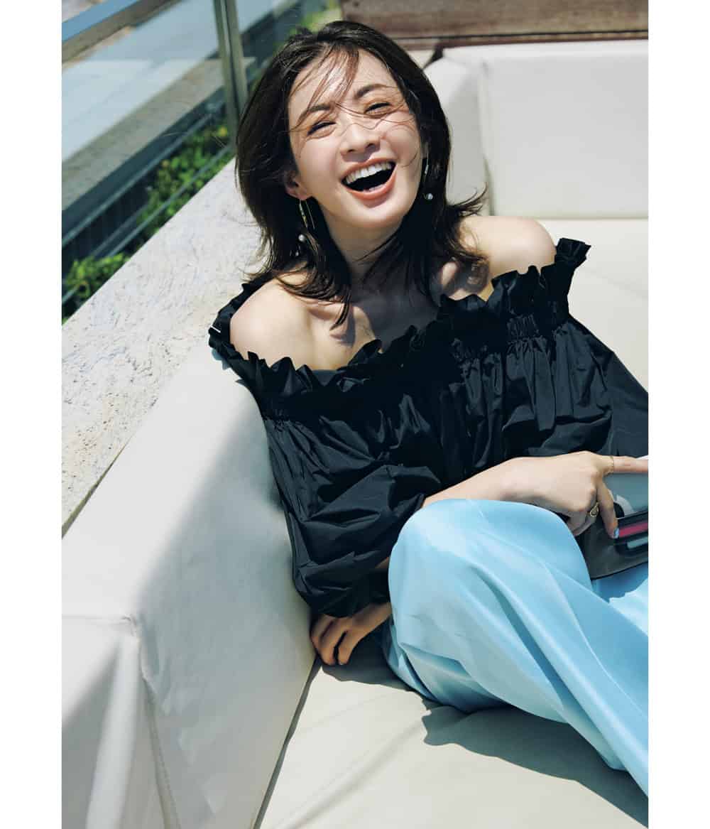 デコルテを取り囲むフリルとボリューム袖が華やかな〝Cygne〟のオフショルは「大人っぽく着られる」と定評のある一枚。艶感のあるキレイ色のセンタープレスパンツで品よく仕上げて。肌見せコーデには隙のないフルメイクよりも血色とツヤを仕込んだヘルシーなカラーレスメイクが似合います。