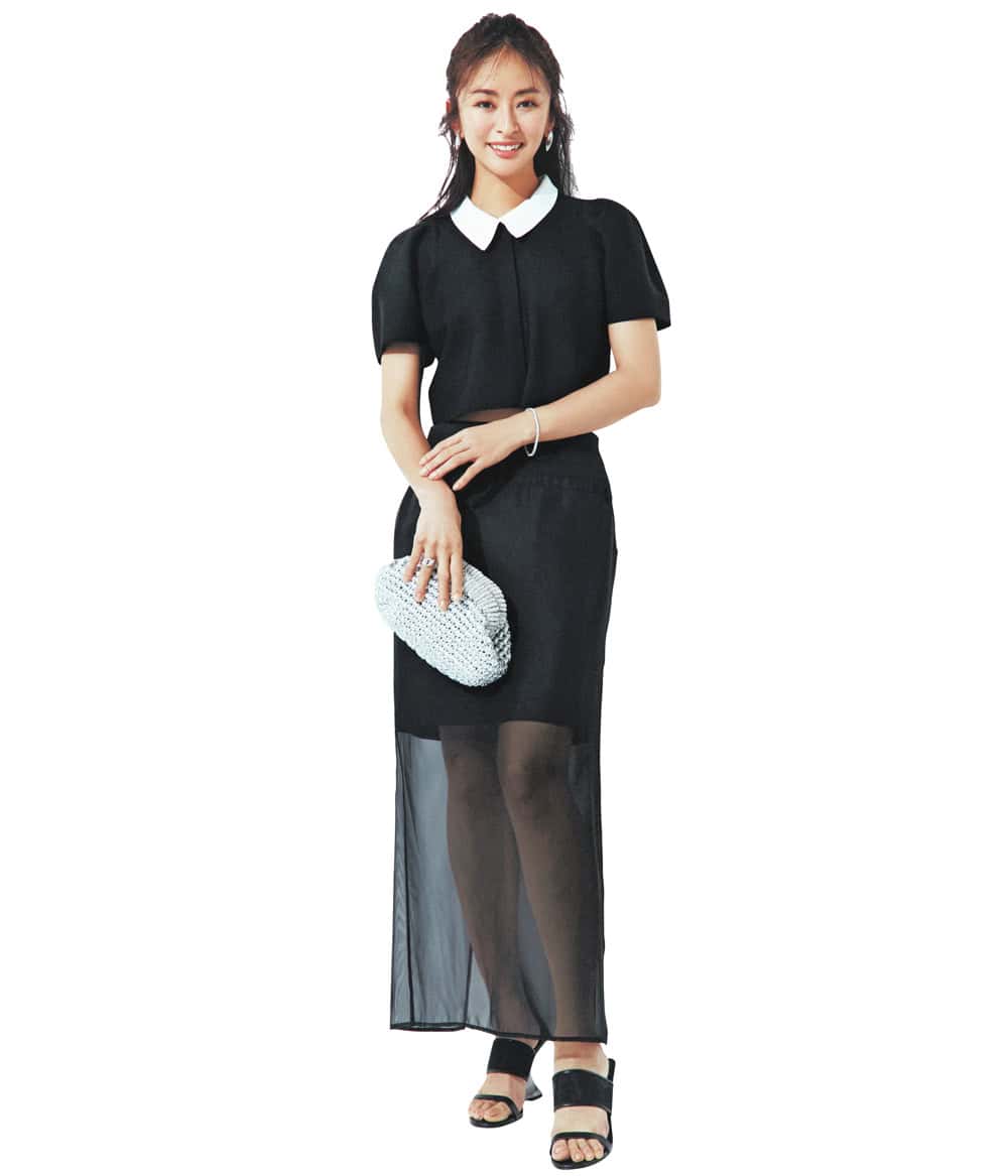 場にふさわしい装いを意識したい会食の日。白衿トップスできちんと感&落ち着いた印象はキープ。ボトムスは今っぽさと個性が光るシアーのタイトスカートでちょっぴり差をつけて。清楚さ×大胆さで自分らしいフォーマルスタイルが完成。