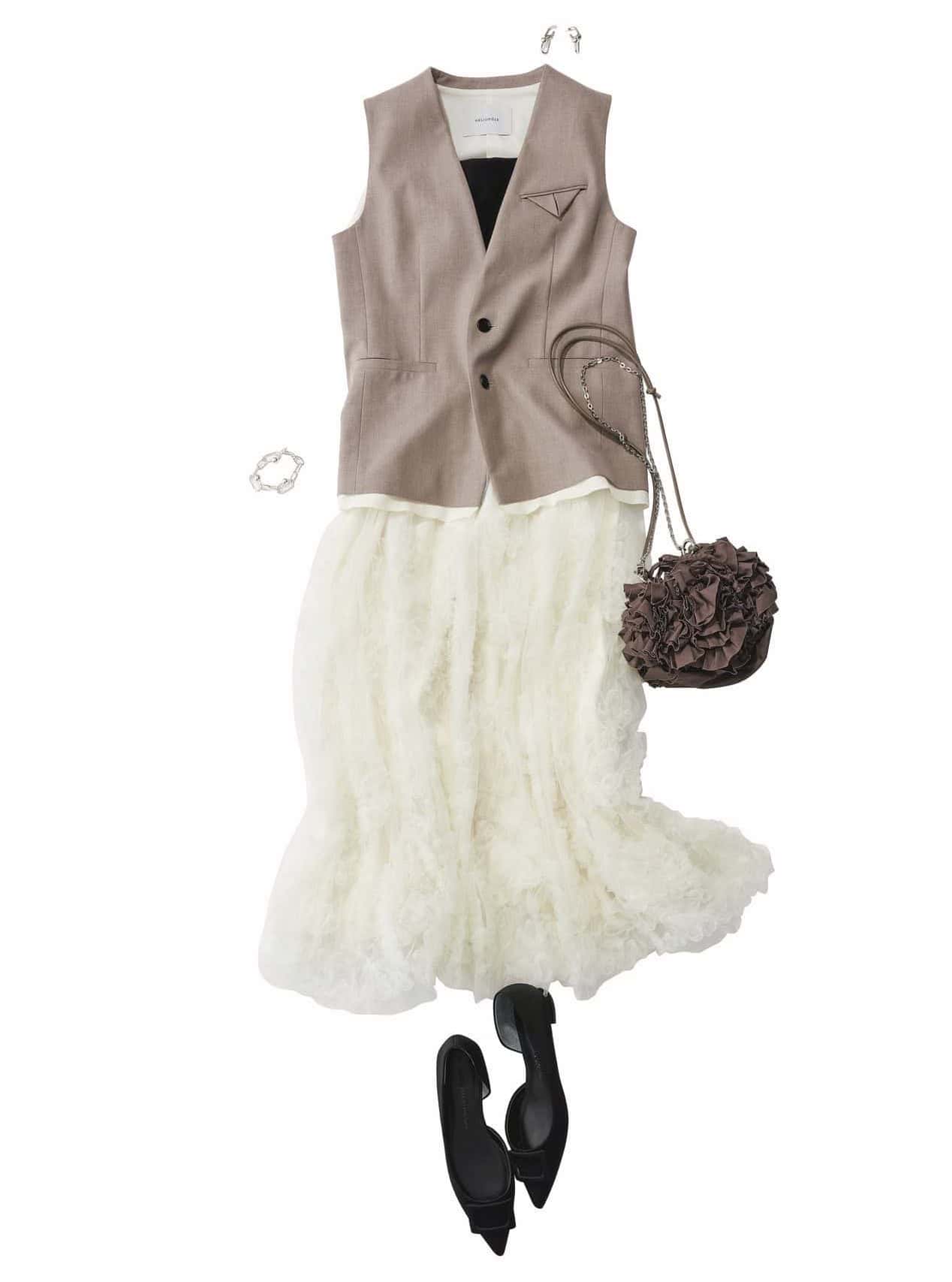 ジレ×スカートでつくる、甘ニッシュコーデ。ふんわりとしたシルエットのチュールスカートで可愛らしさを出しつつ、トレンドデザイン×上品な秋カラーのジレで程良くきちんと感をプラス。柔らかなカラーで統一して、親しみやすい印象に。足元は、ブラックのパンプスでパキッと引き締めて。