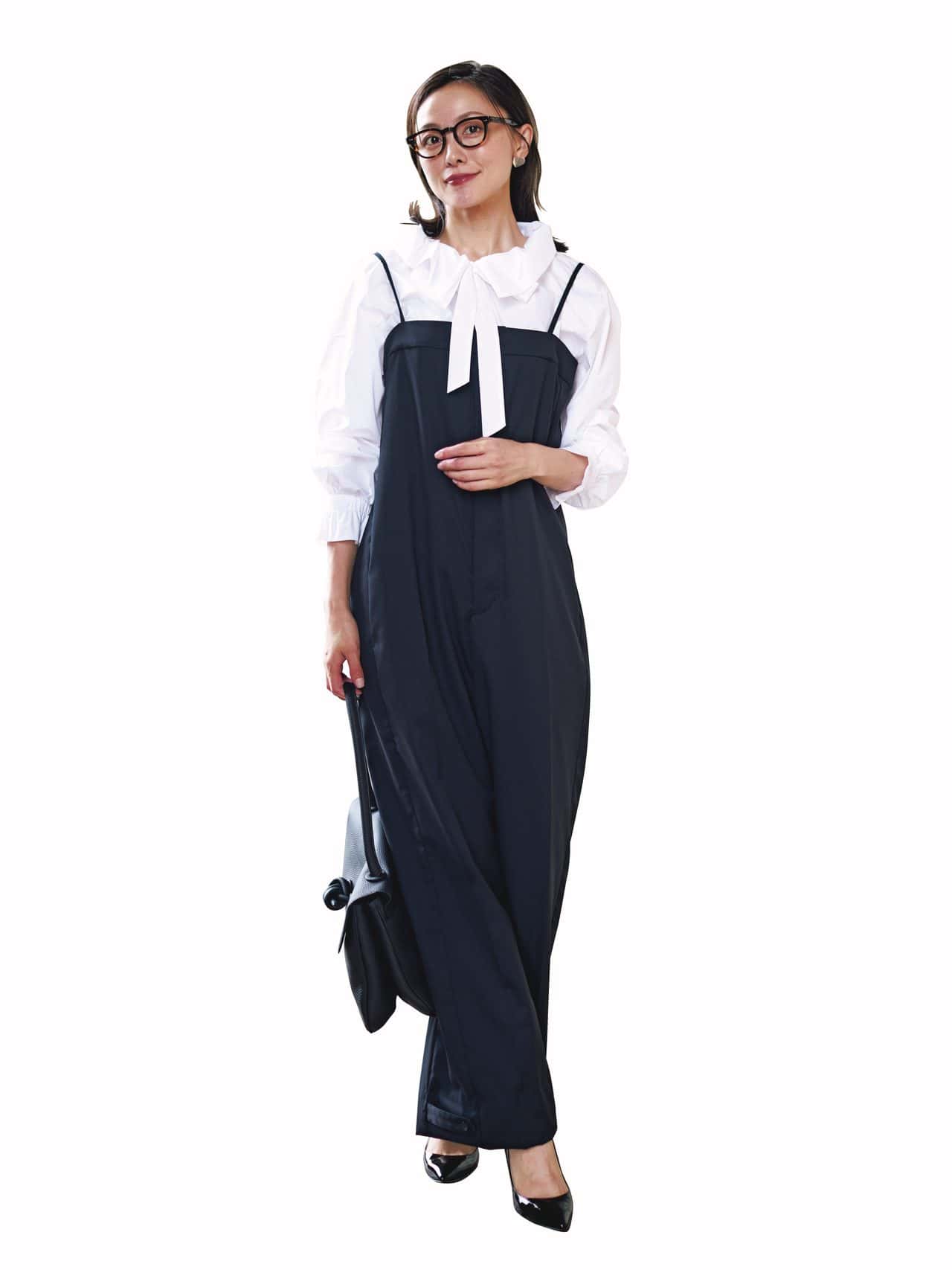 すらっとスマート感抜群なオールインワンを主役に。寂しくなりがちなデコルテまわりは、襟元デザインが大きめのブラウスで飾って華やかに。大ぶりなリボンと、黒面積多めのオールインワンで上品な甘辛に仕上げて。バッグや靴はブラックでまとめて統一感を出すと、より知的な印象に。