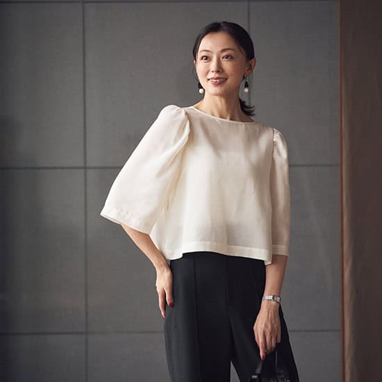 【1枚目】ブラウス¥13.970パンツ¥14,960(ともにDay by Day It’s international)バッグ ¥12,100(Cepica/ジオン商事)ネックレス¥46,200〈ミチウィルウェイ〉ピアス ¥39,600〈モニス〉(ともにフォーティーンショールーム)キャミソール(スタイリスト私物)【2枚目】ブラウス¥13,970パンツ¥14,960(ともにDay by Day It’s international)時計¥20,900(マトウ/エイチエムエスウォッチストア 表参道)イヤリング¥6,820(イットアトリエ/フォーティーンショールーム)