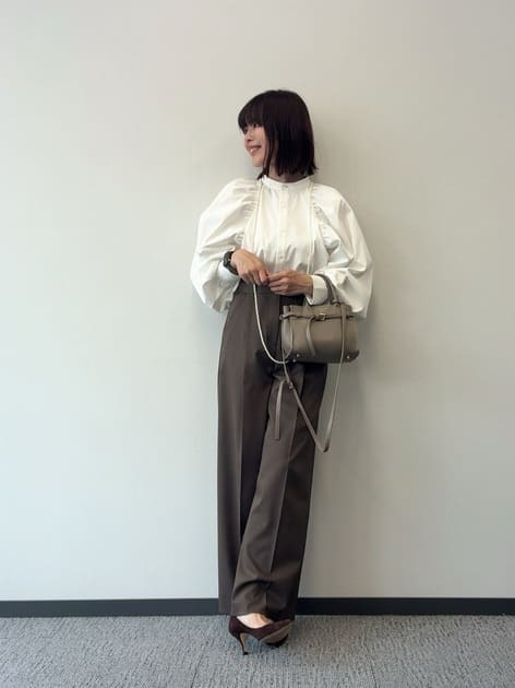 ブラウス¥16,940(トラッツォドンナ)パンツ¥22,990(アンクレイヴ/アンクレイヴ〈オンワード樫山〉)バッグ¥13,750(アルテミス by ダイアナ/アルテミス by ダイアナ アーバンドックららぽーと豊洲店)メガネ¥39,600(ブラン/ライト)ピアス¥99,000(ココシュニック)シューズ/スタイリスト私物