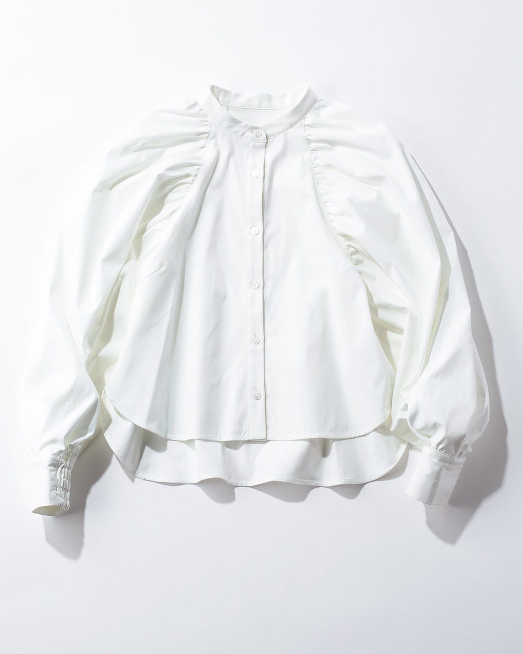 華やか見えには袖ボリュームはマスト、でも着膨れが心配という声を活かし、袖を内側に入れスッキリ見えるようデザインしました。アウトしてバランスがいいように今っぽい短めの丈でサイドはラウンドに割れています。袖口がゴム仕様なので袖丈は季節に合わせ調整することが可能で、どんなボトムスとも相性よくコーディネートができます。