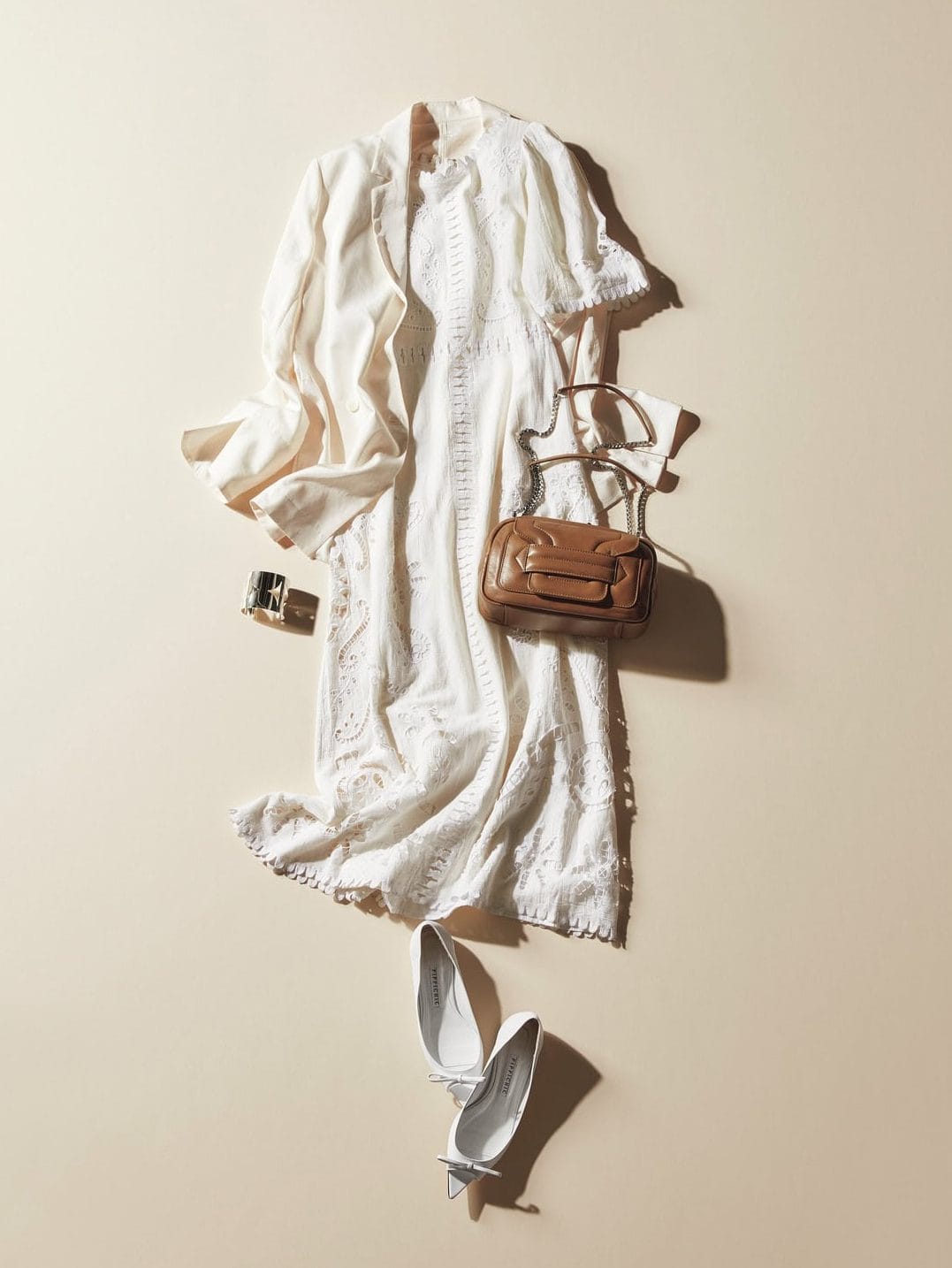 ホワイトワンピに“秋っぽブラウン”のバッグで季節感を