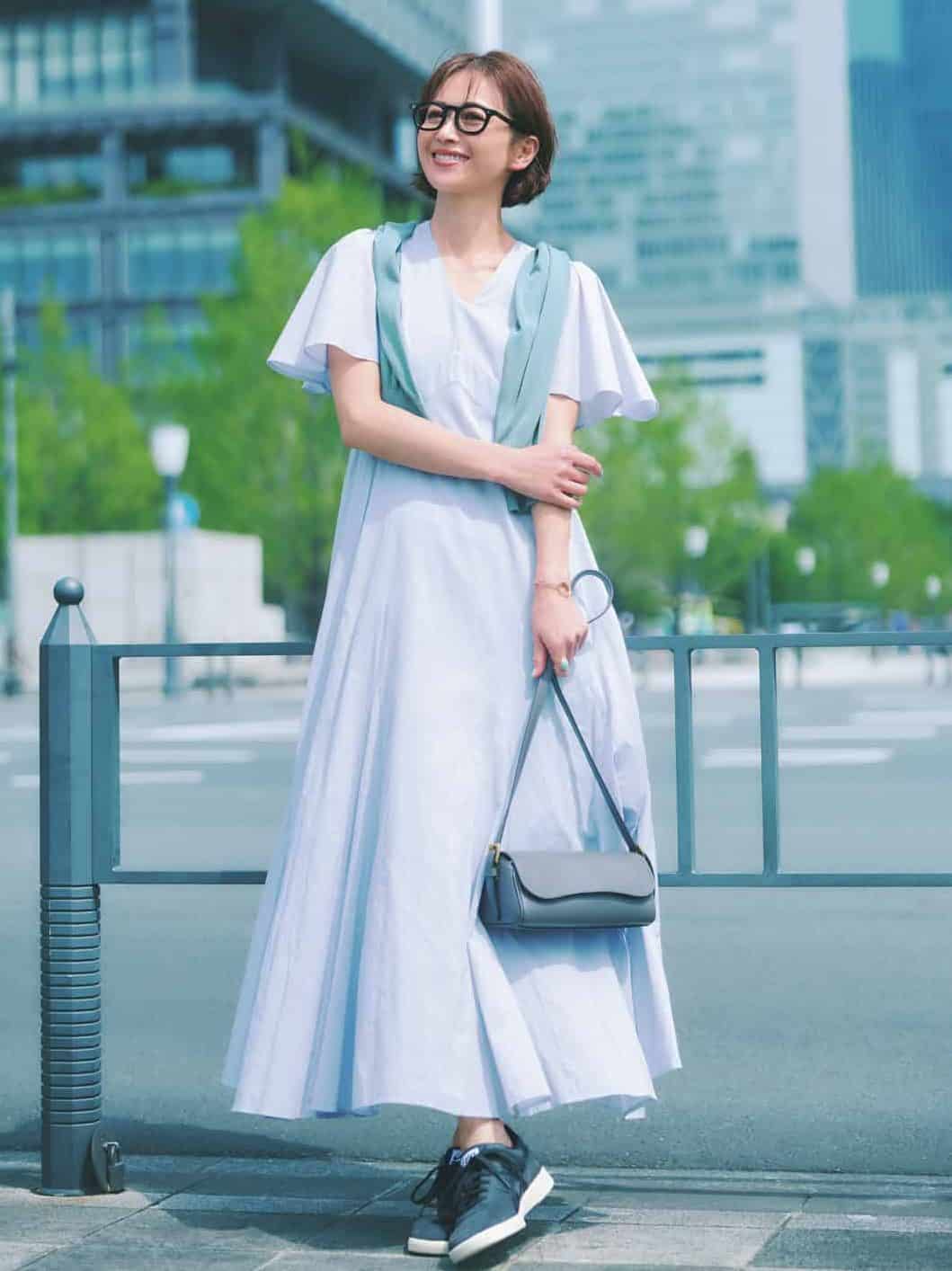 ワンピース¥41,800リング¥330,000(ともにマリハ)カーディガン¥15,400(アンクレイヴ)バッグ¥141,900(J&M デヴィッドソン/J&M デヴィッドソン カスタマーセンター)スニーカー¥12,560(アシックス/アシックスジャパン カスタマーサポート部)メガネ¥46,200(アイヴァン/アイヴァン 東京ギャラリー)バングル¥14,300(マークスティールジュエリー/ココシュニック 新宿タカシマヤ店)