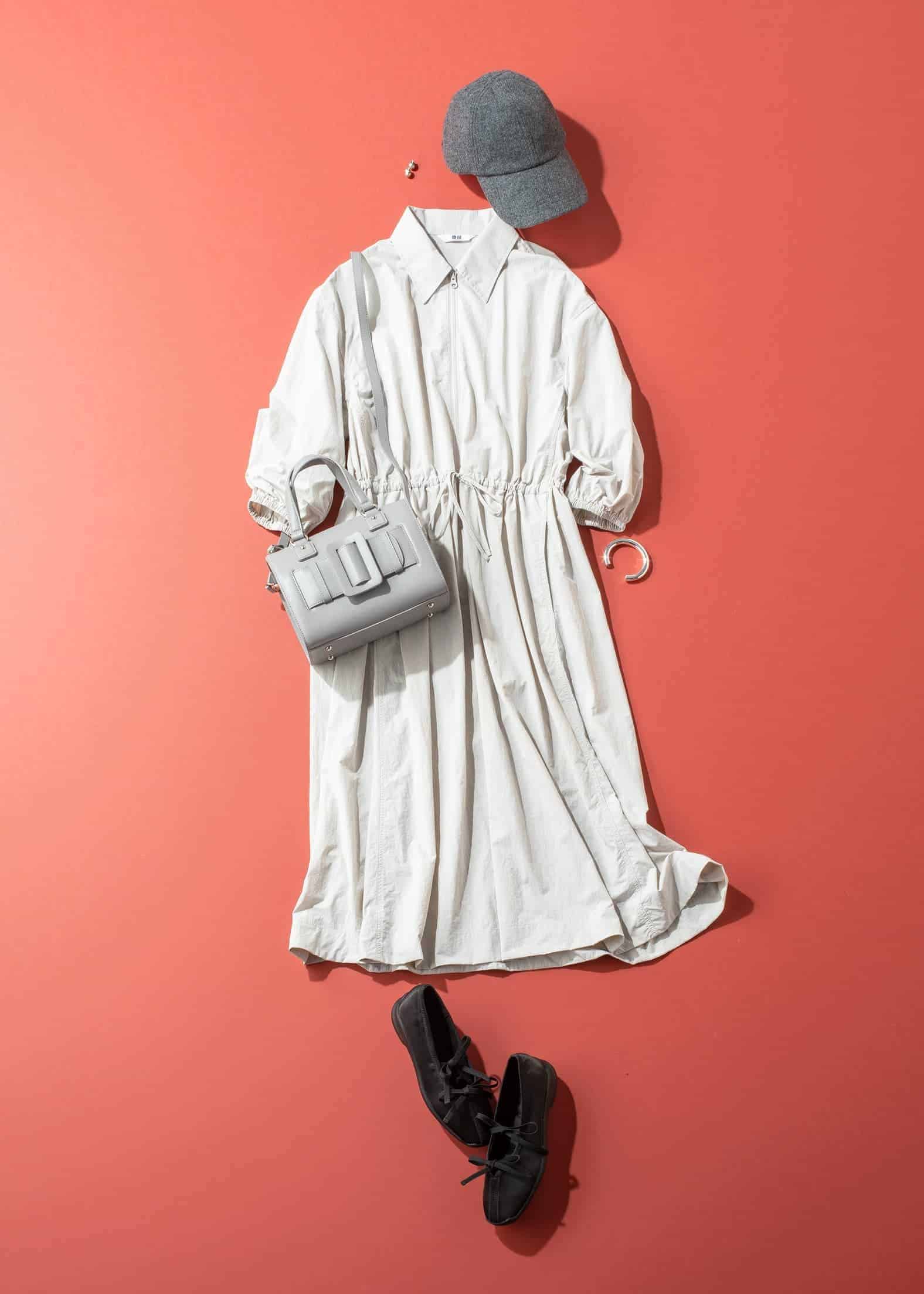 ワンピース¥4,990キャップ¥1,990(ともにUNIQLO)バッグ¥28,600(ダイアナ/ダイアナ 銀座本店)靴¥12,650(ル タロン/ル タロン 有楽町マルイ店)ピアス¥38,500〈ウノアエレシルバーコレクション〉バングル¥25,300〈ワンエーアールバイウノアエレ〉(ともにウノアエレ ジャパン)