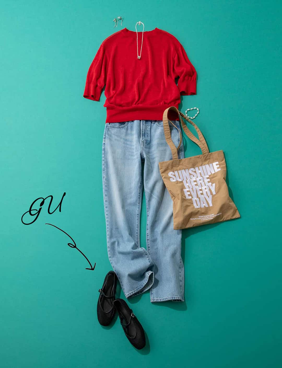 鮮やかな赤ニット×デニムを、GUのメッシュシューズで軽やかにアップデート。涼しげでお手頃なのに大人っぽく見える一足は、秋のデイリーに使える名品です。 GUはシーズンごと最旬デザインのシューズが揃うので、訪れたら忘れずにチェックを!