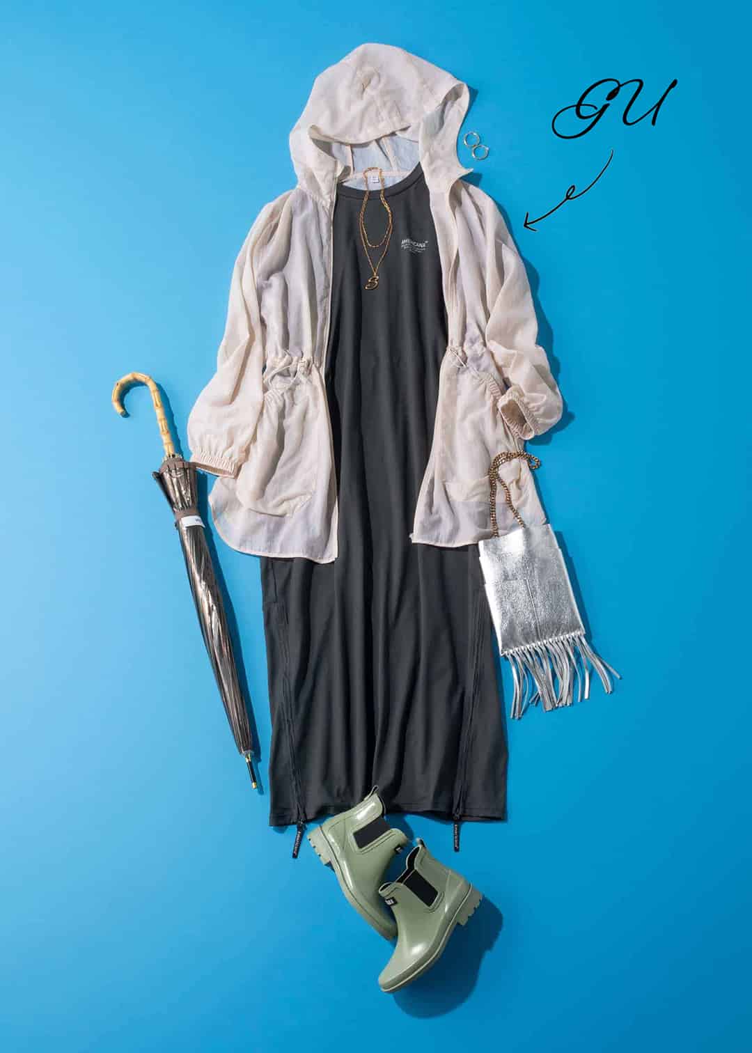 UVカットシアーポケッタブルパーカ¥3,990※一部店舗のみ販売(GU)[撥水・UVカット・軽量・マシンウォッシャブル]ワンピース¥19,800(アメリカーナ×フリークスストア/フリークストア)バッグ¥26,400(ノマディス)シューズ¥16,500(エーグル)ピアス¥77,000(モニス)ネックレス¥12,100(エイチアッシュ)傘¥2,860(Wpc.)