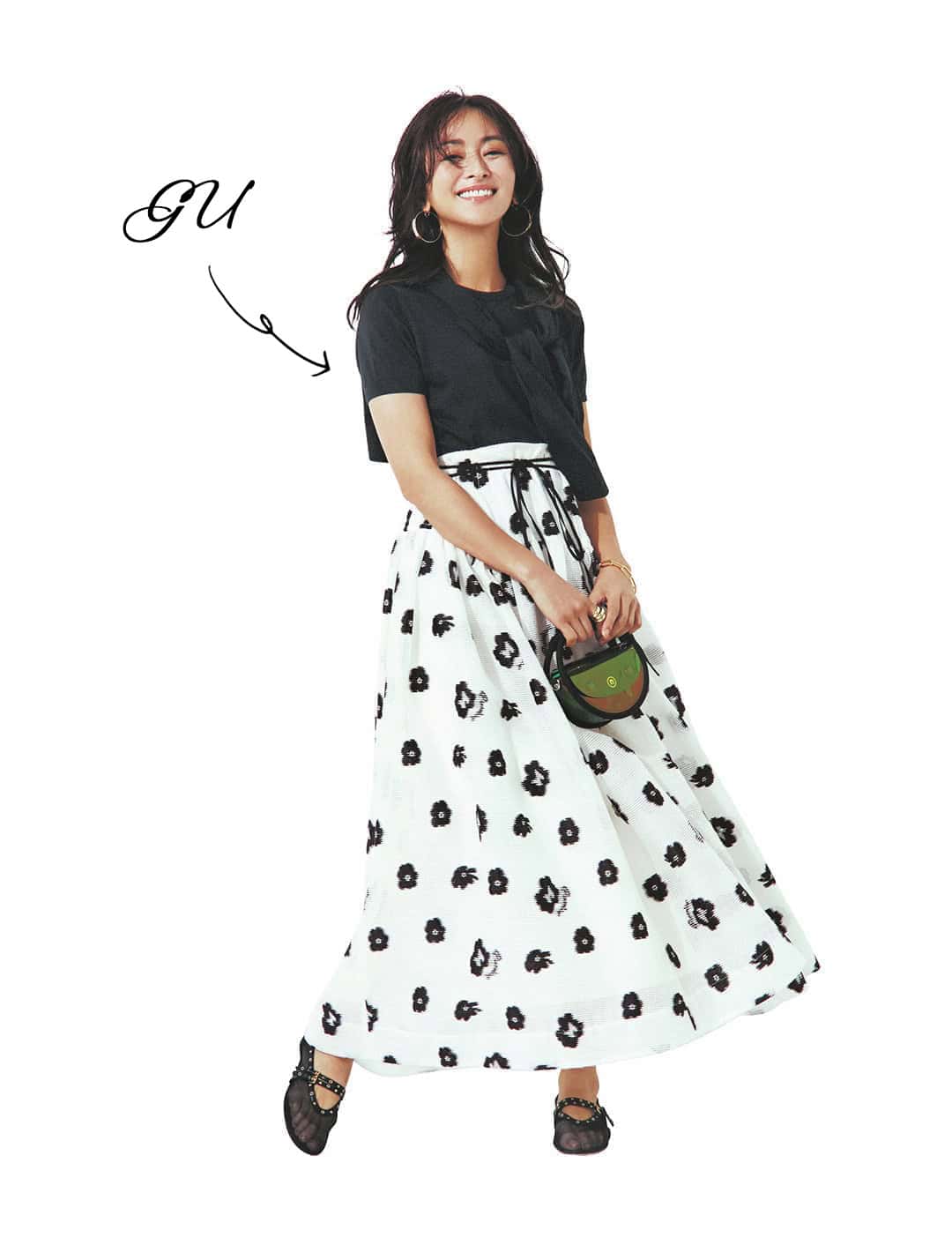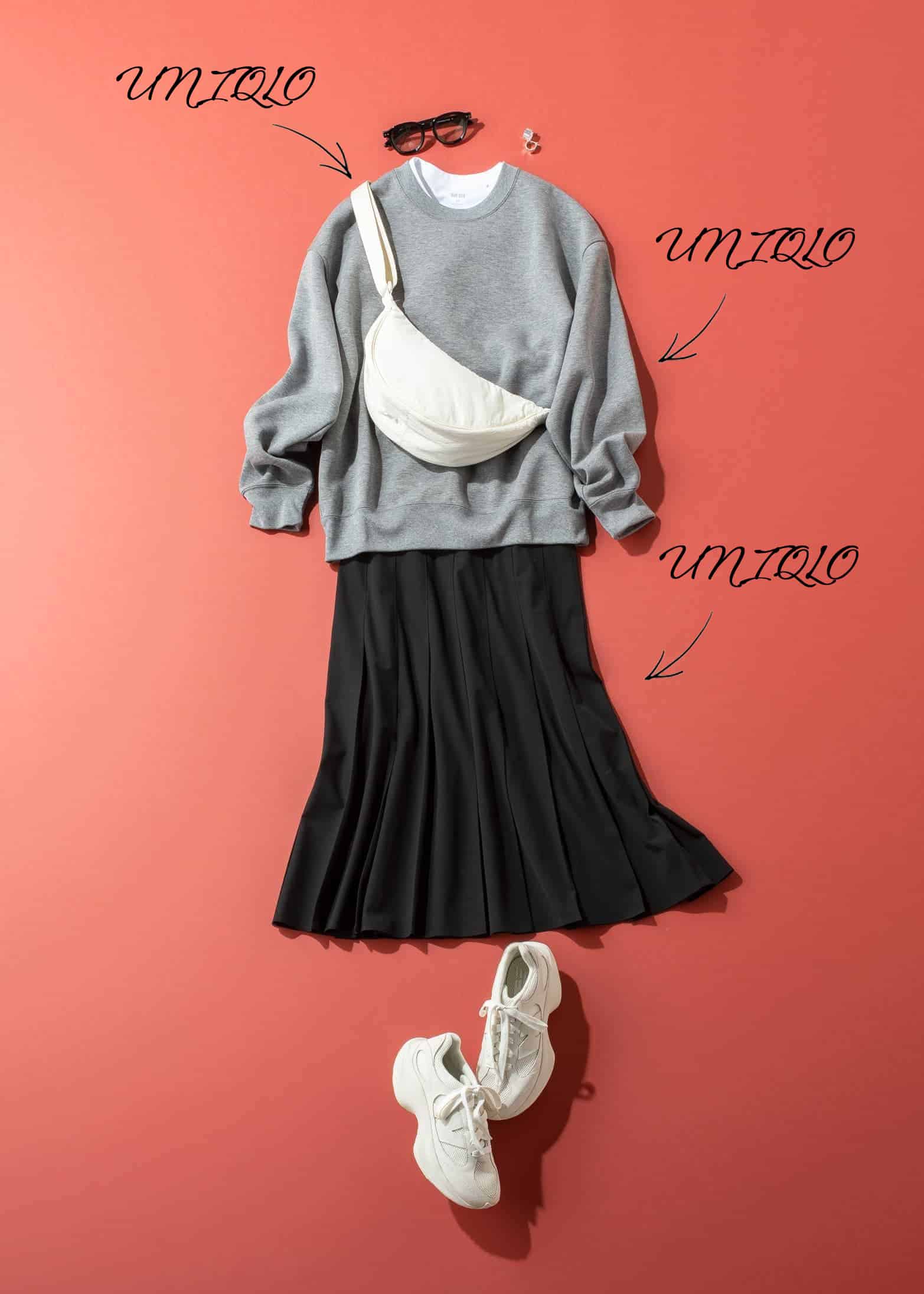 Tシャツのレイヤードに黒のプリーツスカートを合わせて、ラフ過ぎないフェミニンさをひとさじ。気温に合わせて脱ぎ着できるので、気温差のあるこの時期にぴったりのアイテムコーデです。スウェット、Tシャツ、スカートに加えてバッグやアクセントのサングラスもすべてユニクロで揃えても安っぽさなんて皆無!