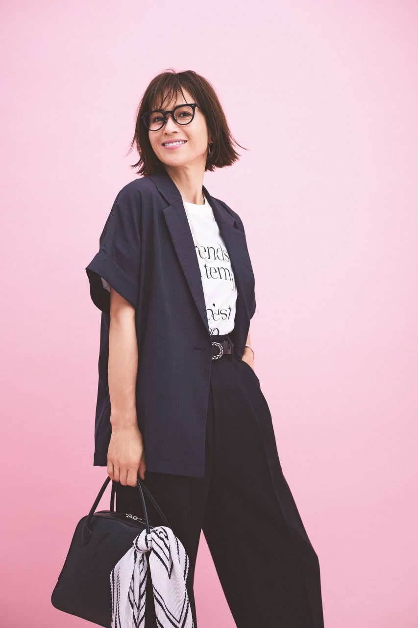 半袖ジャケット¥6,996(ロペピクニック/ベイジュ)ロゴTシャツ¥3,990(アンフィーロ)パンツ¥4,950(BASEMENT online)バッグ¥79,200(メゾン カナウ/ヤマニ)パンプス¥39,600(ピッピシック/ベイジュ)ベルト¥27,500(ニアー ニッポン/ニアー)スカーフ¥6,930(アンタイトル)メガネ¥39,600(プロポ/プロポデザイン)ピアス¥47,300パールネックレス¥46,200(ともにリューク)バングル¥7,560(アビステ)